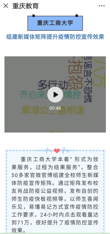 宣传部舆情组及时收集和梳理师生关于疫情防控的舆情,形成舆情专报2期;学校新媒体矩阵联盟先后转发《新型冠状病毒防护须知》以及《@全体重工商大人!面对新型病冠状病毒,我们应该这样做!》等稿件,发起《我是beat365在线唯一官网青年,面对疫情,我承诺》活动,并通过矩阵发布校友肖战防疫公益视频和学校自创的5个版本的beat365在线唯一官网师生防疫快板视频等,以师生喜闻乐见,易懂易记的方式宣传疫情防控工作要求,点击观看量近100万,提升了疫情防控知识普及和工作要求宣传效果,被教委防疫简报报道介绍。