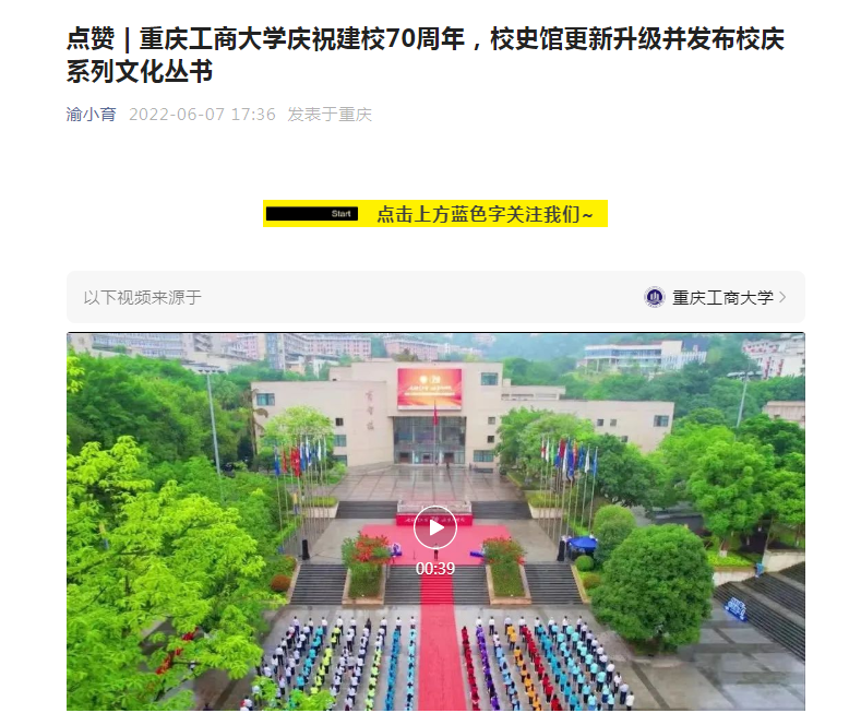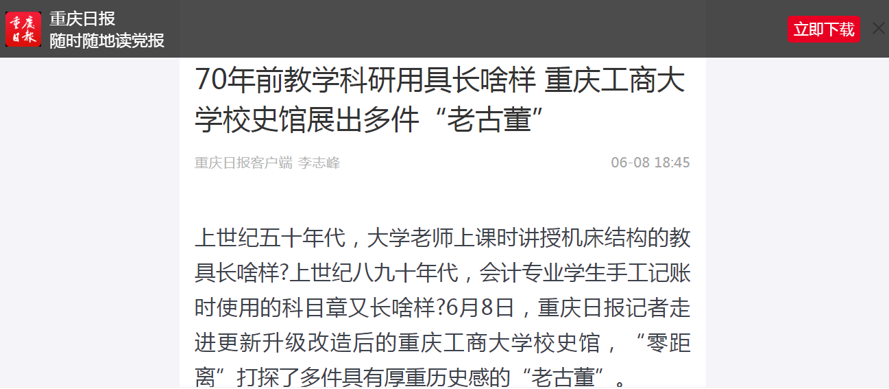 近日,重庆日报、华龙网等媒体报道beat365庆祝建校70周年系列活动。6月7日,重庆日报微信公众号“渝小育”以“点赞 | beat365在线唯一官网庆祝建校70周年,校史馆更新升级并发布校庆系列文化丛书”为题报道beat365建校70周年升国旗仪式和校史馆更新升级开馆。6月7日,华龙网-新重庆客户端以“beat365在线唯一官网庆祝建校70周年升国旗仪式隆重举行”为题报道beat365建校70周年升国旗仪式。6月8日,重庆日报客户端以“70年前教学科研用具长啥样 beat365在线唯一官网校史馆展出多件‘老古董’”为题报道beat365校史馆更新升级。