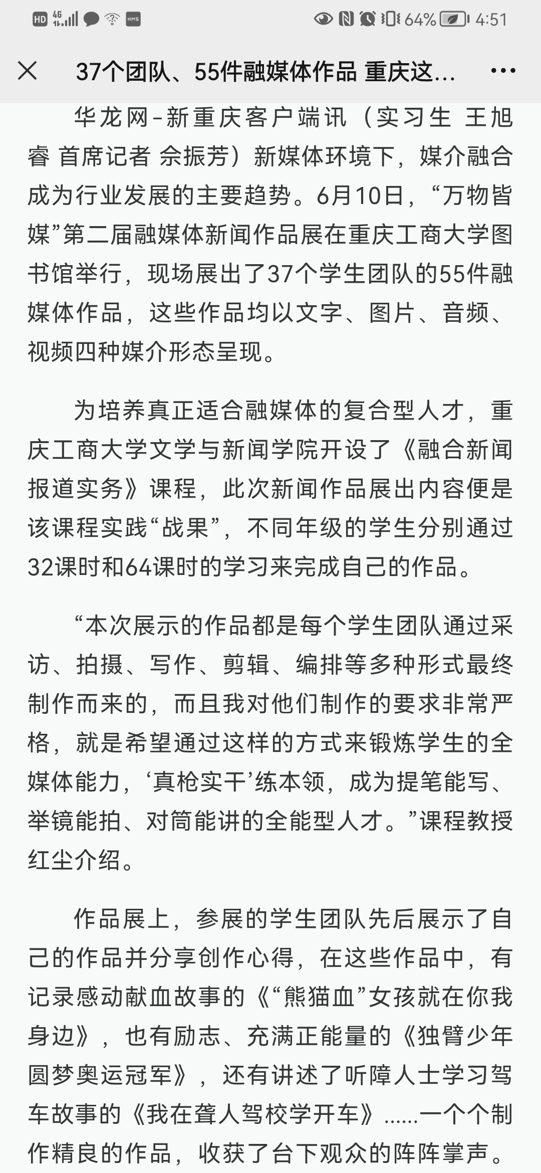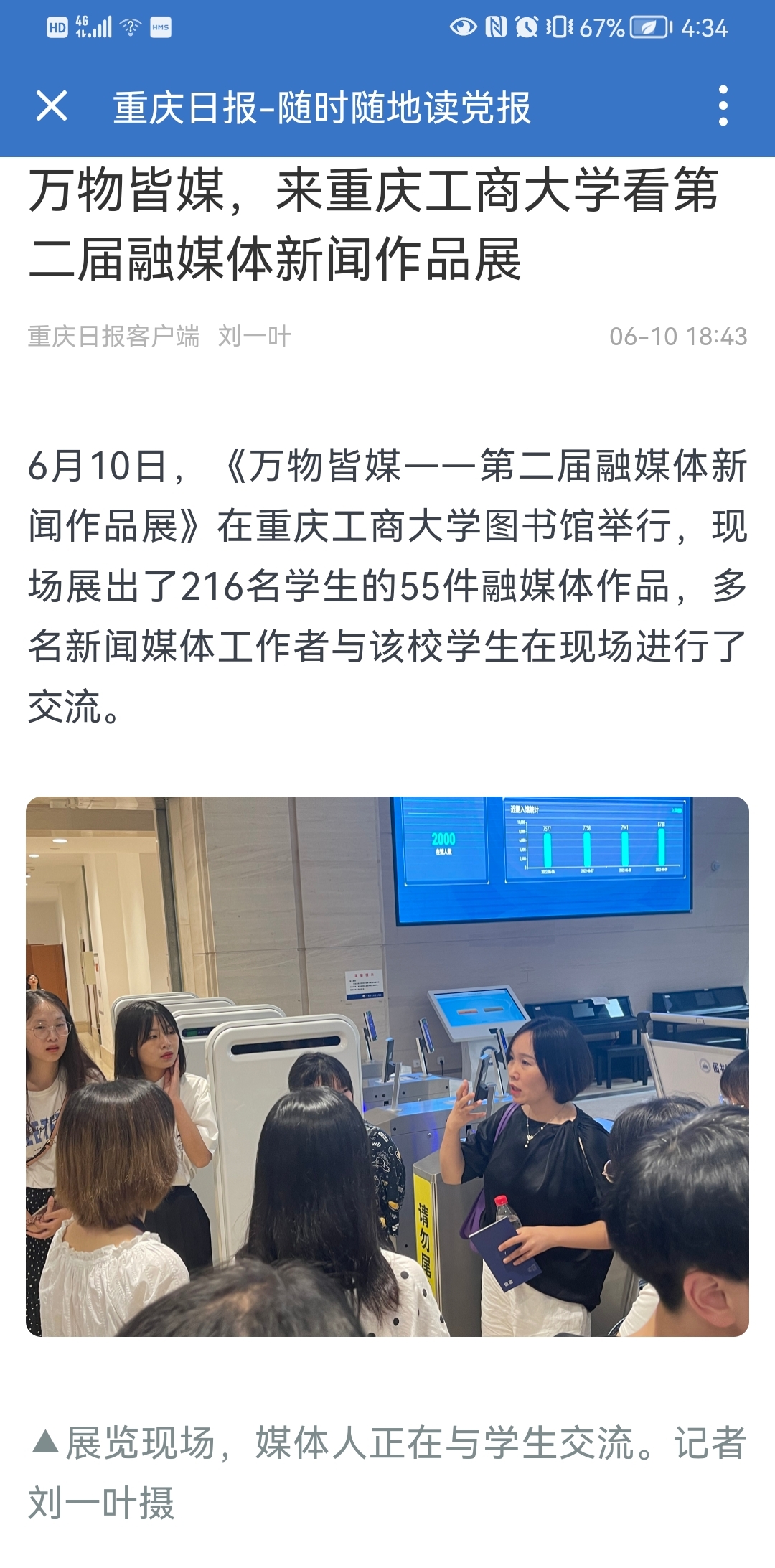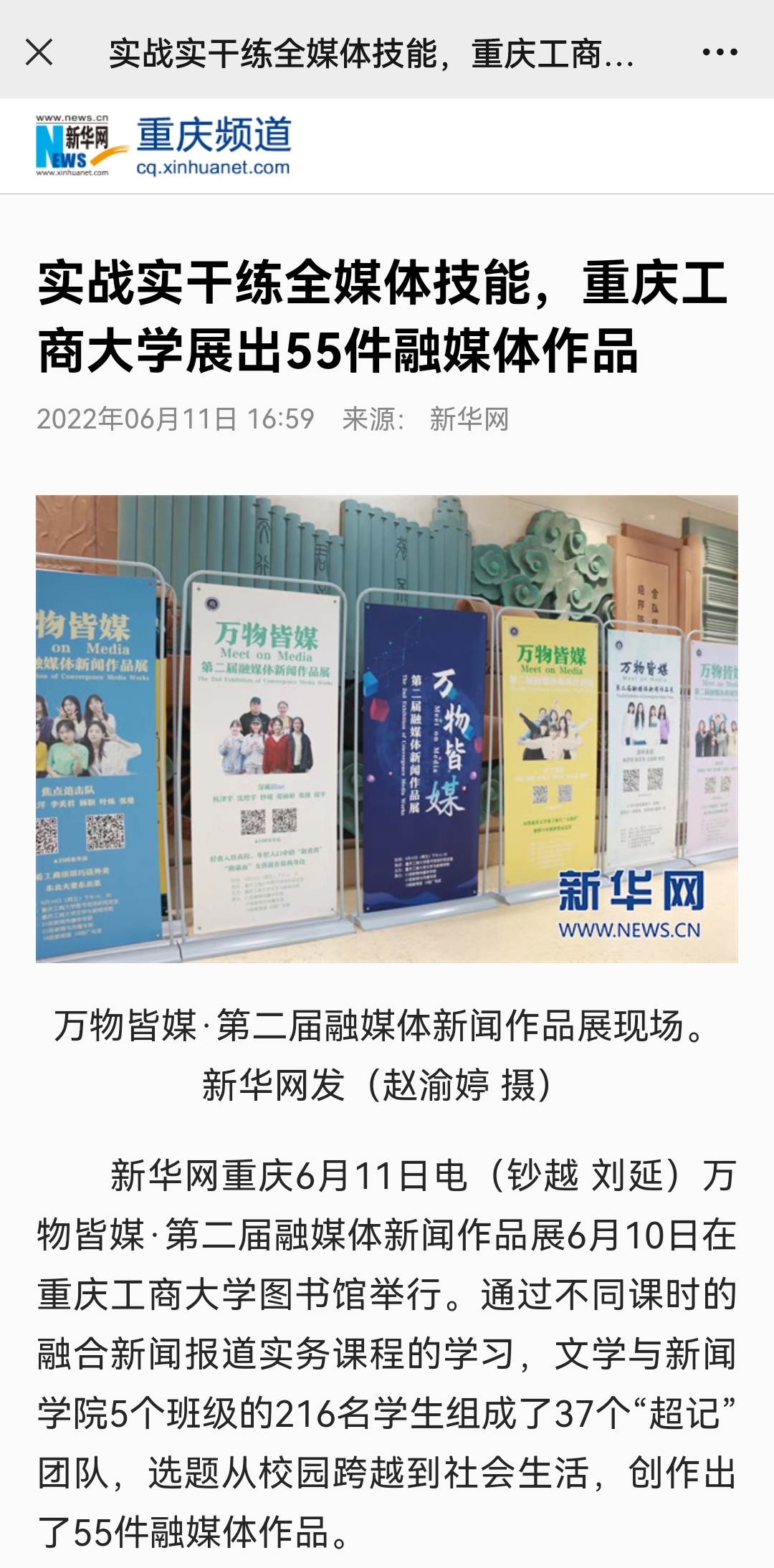 近日,重庆日报、新华网重庆频道等近10家媒体报道beat365文学与新闻学院万物皆媒·第二届融媒体新闻作品展。6月10日,重庆日报以“万物皆媒,来beat365在线唯一官网看第二届融媒体新闻作品展”为题报道beat365文学与新闻学院万物皆媒·第二届融媒体新闻作品展。华龙网-新重庆客户端以“37个团队、55件融媒体作品 重庆这所高校让学生“真枪实干”练本领”为题报道beat365文学与新闻学院万物皆媒·第二届融媒体新闻作品展。新华网以“实战实干练全媒体技能,beat365在线唯一官网展出55件融媒体作品”为题报道beat365文学与新闻学院万物皆媒·第二届融媒体新闻作品展。上游新闻以“万物互媒—第二届融媒体新闻作品展,55件作品展示当代大学生创作实力”为题报道beat365文学与新闻学院万物皆媒·第二届融媒体新闻作品展。今日头条、网易、澎湃新闻、新浪新闻等媒体以“实战实干练全媒体技能,beat365在线唯一官网展出55件融媒体作品”为题进行转载报道。