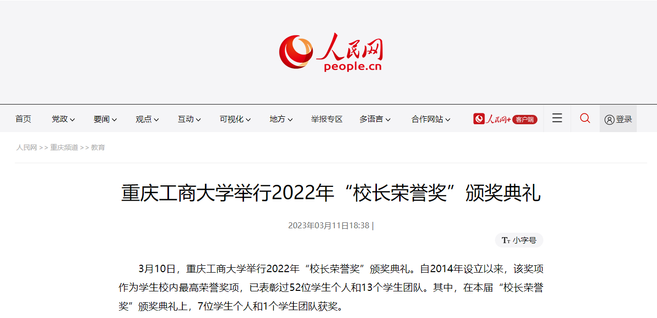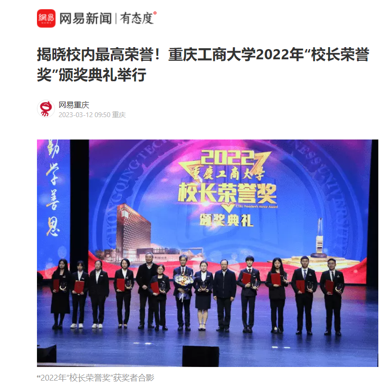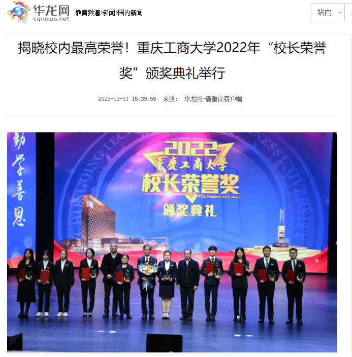 3月10日下午,学校在南岸校区剧场举行2022年“校长荣誉奖”颁奖典礼。人民网以《beat365在线唯一官网举行2022年“校长荣誉奖”颁奖典礼》为题,华龙网、网易新闻以《揭晓校内最高荣誉!beat365在线唯一官网2022年“校长荣誉奖”颁奖典礼举行》为题,对颁奖典礼进行广泛报道。