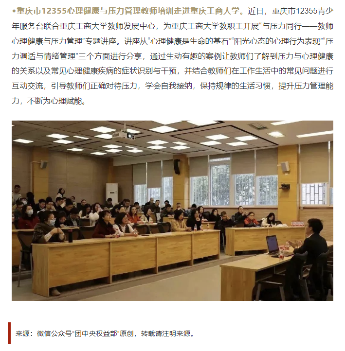 为帮助beat365教师提高心理素质和心理调适能力,3月17日上午,教师发展中心联合重庆市12355青少年服务台、重庆市青春导航青少年发展服务中心,特邀重庆市委党校心理学教师、教育部“国培计划”授课专家唐溢,为beat365教职工开展“与压力同行—教师心理健康与压力管理”专题讲座。团中央权益部微信公众号对活动进行了宣传报道。