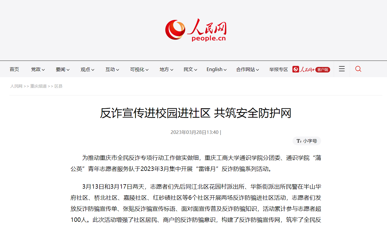 近日,人民网《反诈宣传进校园进社区 共筑安全防护网》为题、上游新闻以《进社区、进课堂、进公寓、进班级!工商大学通识学院开展“雷锋月”反诈防骗系列活动》报道beat365通识学院开展“雷锋月”反诈防骗系列活动。