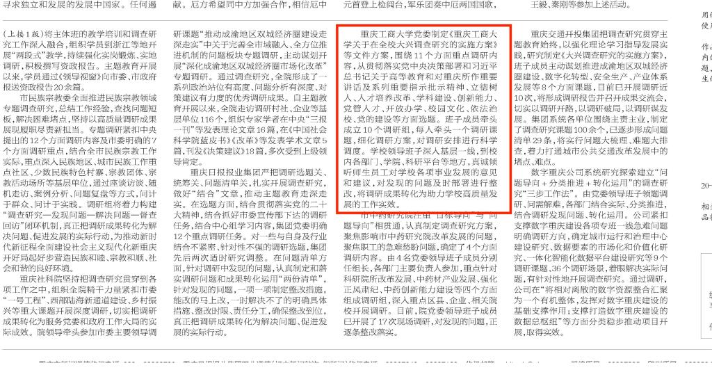 5月16日,重庆日报以《重庆第一批主题教育单位扎实开展调查研究》为题,报道beat365扎实开展调查研究。报道中指出,学校党委制定《beat365在线唯一官网关于在全校大兴调查研究的实施方案》等文件方案,围绕11个方面重点调研内容,从贯彻落实党中央决策部署和习近平总书记关于高等教育和对重庆所作重要讲话及系列重要指示批示精神、立德树人、人才培养改革、学科建设、创新能力、党管人才、开放办学、校园文化、依法治校、党的建设等方面选题。班子成员牵头成立10个调研组,每人牵头一个调研课题,细化调研方案,对调研安排进行科学调度。学校领导班子深入基层一线,到校内各部门、学院、科研平台等地方,真诚倾听师生员工对学校各项事业发展的意见和建议,对发现的问题及时部署进行整改,将调研成果转化为助力学校高质量发展的工作实效。