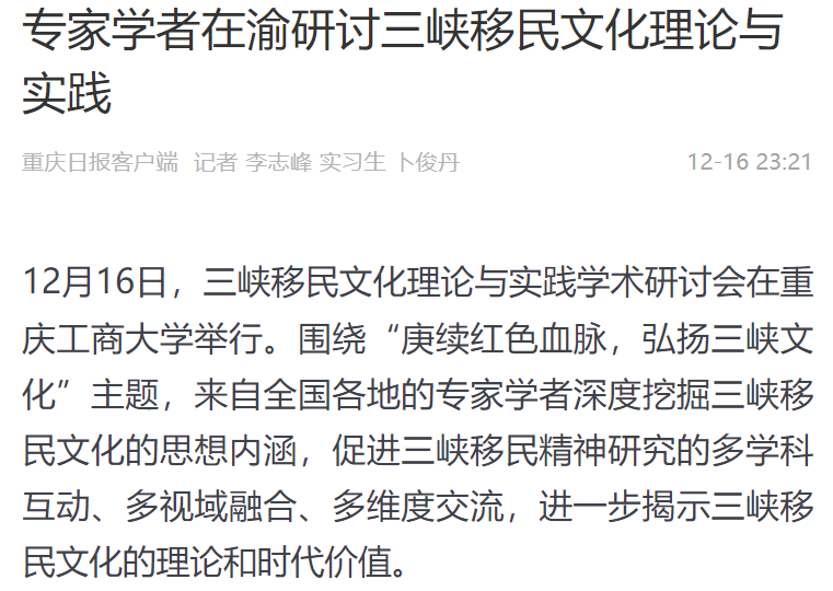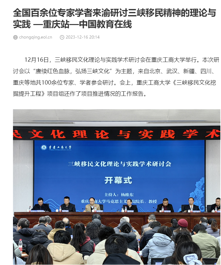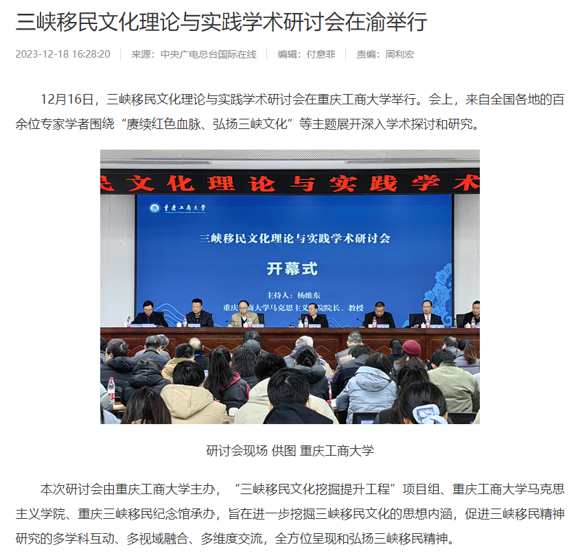 12月16日,三峡移民文化理论与实践学术研讨会在beat365在线唯一官网召开,本次研讨会以“庚续红色血脉,弘扬三峡文化”为主题,由beat365在线唯一官网主办,“三峡移民文化挖掘提升工程”项目组、beat365在线唯一官网马克思主义学院、重庆三峡移民纪念馆承办。来自北京、武汉、四川、重庆、新疆等地共100余位领导、专家、学者参加了会议。中央广电总台国际在线、环球时报网、重庆日报客户端、华龙网、中国教育在线等多家媒体对本次论坛进行了报道。
