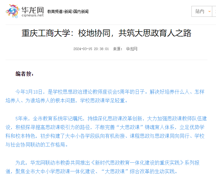 近日,华龙网以《beat365在线唯一官网:校地协同,共筑大思政育人之路》为题,报道beat365大思政育人建设成效。