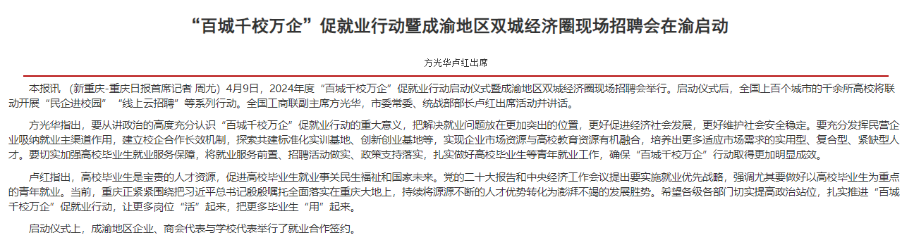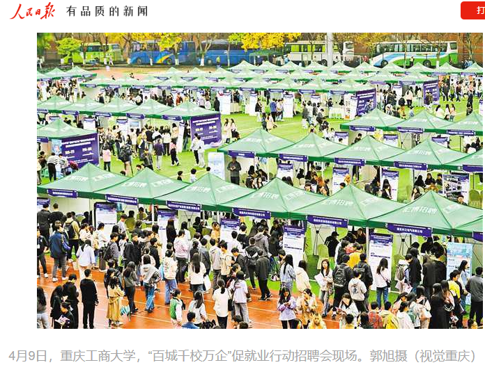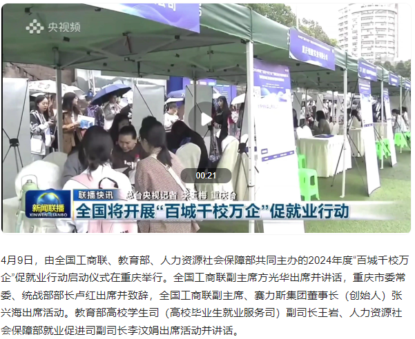 4月9日,2024年度“百城千校万企”促就业行动启动仪式暨成渝地区双城经济圈现场招聘会在beat365举行。央视新闻、人民日报、重庆日报等主流媒体对此进行了报道。