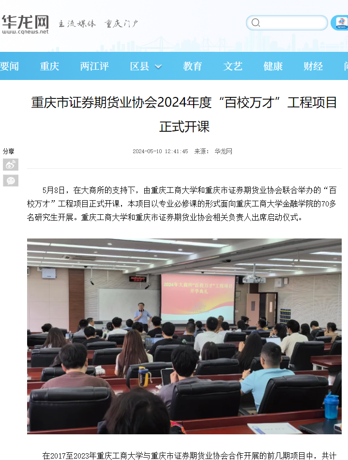 金融学院为深化研究生教育教学改革,在研究生院的大力支持下,从2017年开始,持续与大连商品交易所、重庆市证券期货业协会、联合开展“百校万才”工程项目,以项目制方式与金融专硕课程有机衔接,将理论与实践相结合,积极培养应用型复合型金融人才。5月8日,2024年大商所“百校万才”工程项目班开班仪式在研究生院明智楼110405举行。重庆日报、华龙网对此进行了报道。