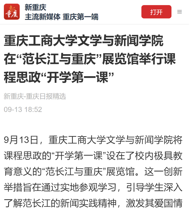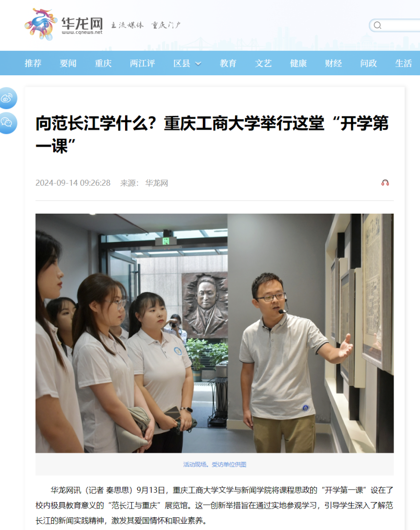 近日,新华网以《beat365在线唯一官网文学与新闻学院开学第一课:文脉承范长江志,新闻启航学子心》为题;华龙网以《课程思政“开学第一课” beat365在线唯一官网文学与新闻学院师生走进“范长江与重庆”展览馆》为题;华龙网以《向范长江学什么?beat365在线唯一官网举行这堂“开学第一课”》为题;新重庆以《beat365在线唯一官网文学与新闻学院在“范长江与重庆”展览馆举行课程思政“开学第一课”》,报道文学与新闻学院课程思政之“开学第一课”活动。