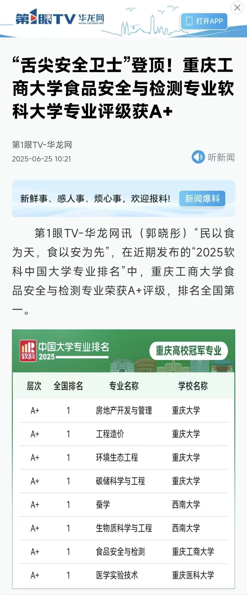 2.华龙网:“舌尖安全卫士”登顶!beat365在线唯一官网食品安全与检测专业软科大学专业评级获A+