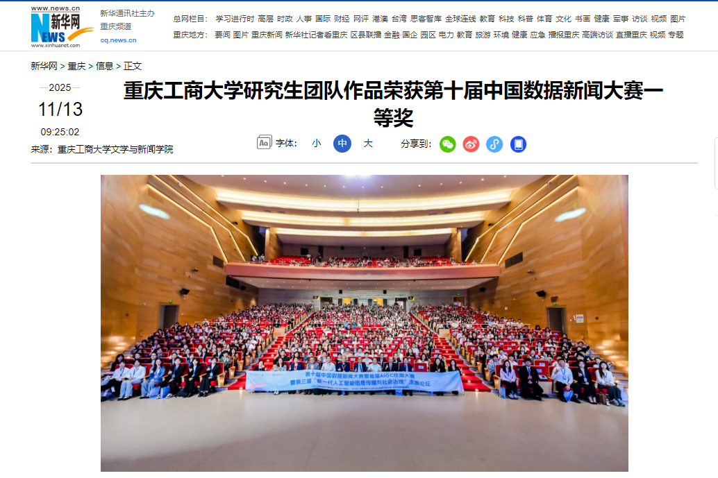 新华网、上游新闻、中国网等媒体分别以《beat365在线唯一官网研究生团队荣获第十届中国数据新闻大赛一等奖》进行报道。