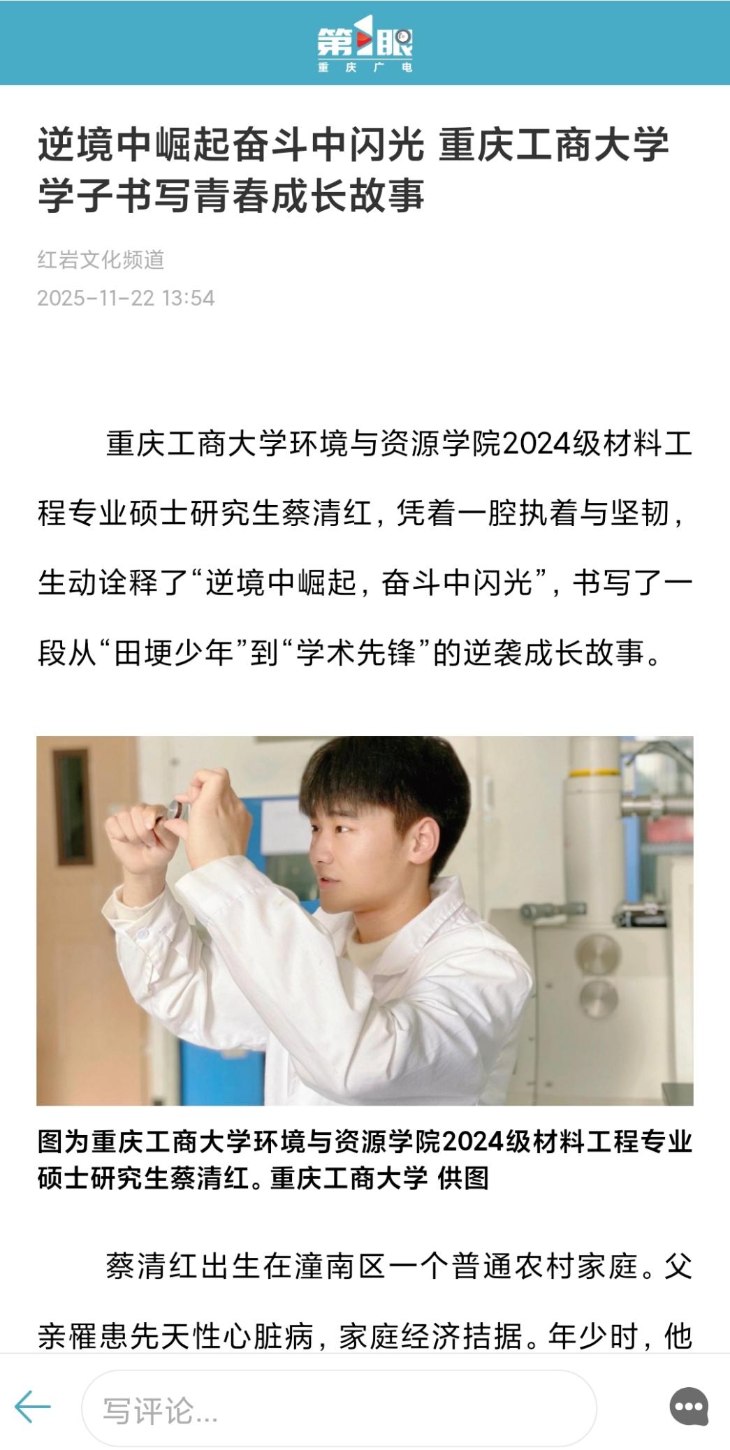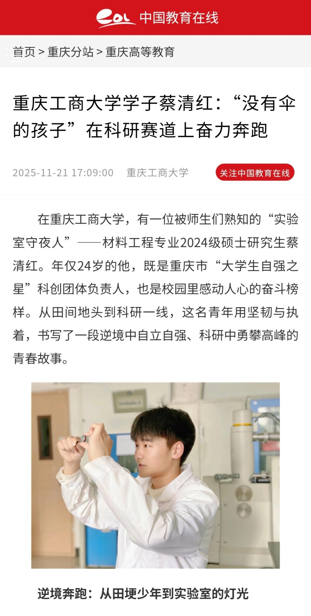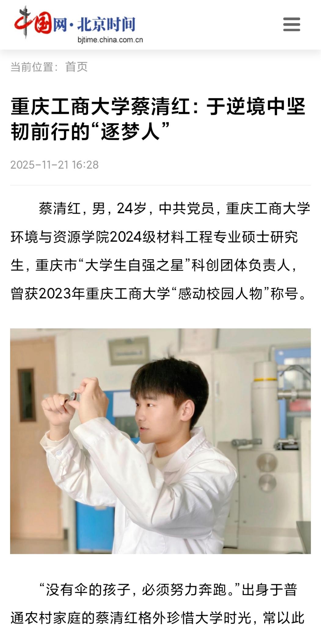 中国网・以《beat365在线唯一官网蔡清红:于逆境中坚韧前行的“逐梦人”》为题,中国教育在线以《beat365在线唯一官网学子蔡清红:“没有伞的孩子”在科研赛道上奋力奔跑》为题,华龙网以《beat365在线唯一官网研究生蔡清红:从田埂少年到科研先锋的奋斗之路》为题,第1眼新闻以《逆境中崛起奋斗中闪光 beat365在线唯一官网学子书写青春成长故事》为题,今日头条以《从流水线到实验室:一个“没有伞”的农村娃如何跑出科研报国路》为题,进行报道。