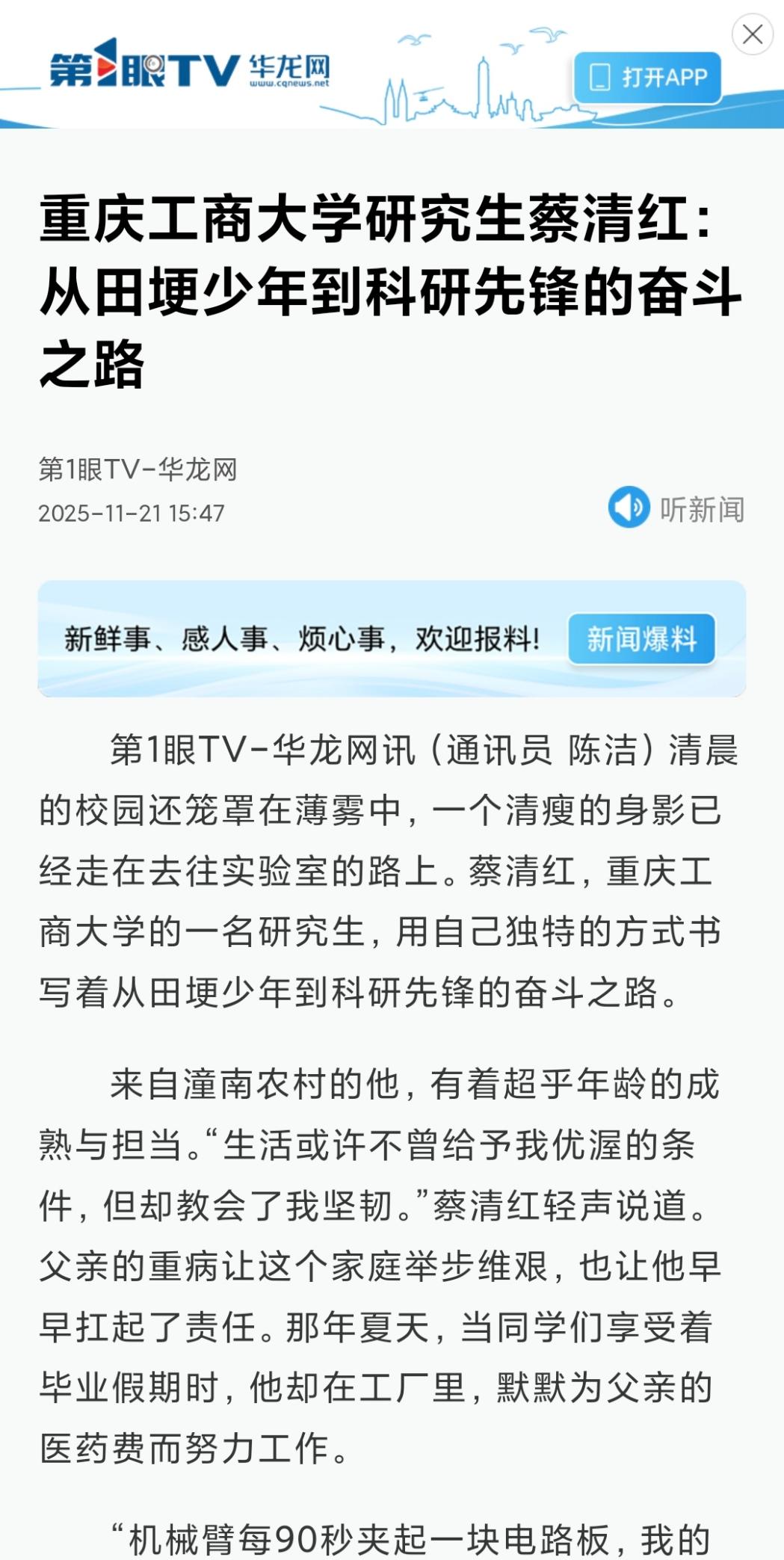 3.华龙网以《beat365在线唯一官网研究生蔡清红:从田埂少年到科研先锋的奋斗之路》