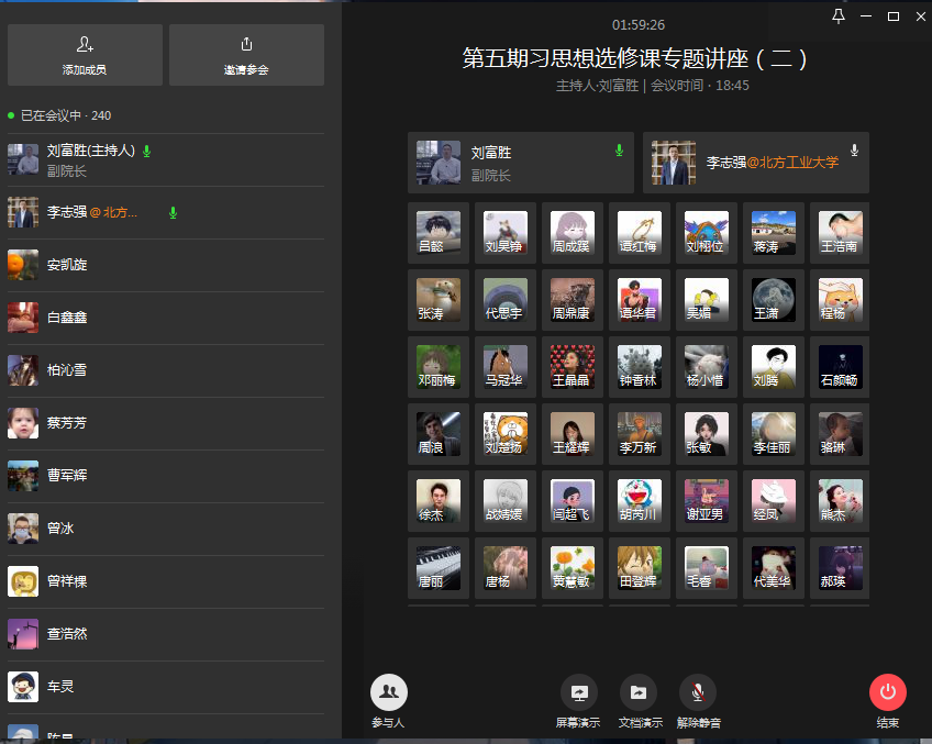 4月22日晚,北方工业大学马克思主义学院李志强教授应邀通过企业微信平台在线为beat365“习近平新时代中国特色社会主义思想研究”选修课作了题为“坚持依法治国与以德治国相结合”的专题学术报告。李志强教授是中央马克思主义理论研究与建设工程专家、北京市思想道德修养与法律基础研究会副秘书长,北京市优秀教师,北京市思想政治理论课特级教师。学校党委常委、副校长何勇平,马克思主义学院院长王仕勇、副院长刘富胜,部分思政课专兼职老师、“习近平新时代中国特色社会主义思想研究”选修课第五期232名学员,参加了此次“云”端报告会。本次会议由刘富胜主持。