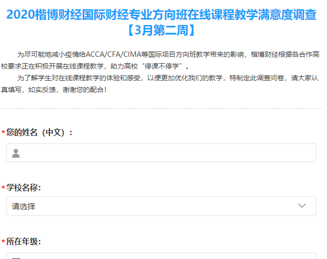 根据会计学院与楷博财经合作办学的教学安排,提前三周就调研国际项目学生的在线学习条件。早在2月8号,因亚洲地区3月份的全球统考取消,学院与楷博财经双方就有意开展在线教学,联合对国际项目学生进行了问卷调查,了解疫情期间学生对线上课程学习的需求和建议。调查问卷结果显示,98%以上的学生具备上网学习的条件;针对不具备上网学习条件的同学,学院及楷博财经积极协助最终解决困难,使ACCA/CIMA国际项目班全体学生100%达到在线学习条件。同时,针对问卷结果,为在问卷调查中表示缺乏口罩等防护物资的同学给予及时援助。