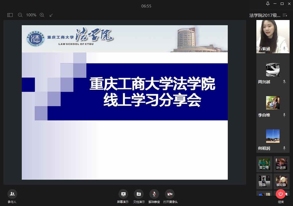 4月10日下午,2017、2018级学生通过企业微信开展了长达三个小时的线上学习分享会,学院班子成员、系主任、实践教学主任、院级教学督导、学院教师和辅导员30余人参加了会议。分享会上,同学们就近期在线学习情况畅所欲言。2017级法学1班杨嘉豪谈到,线上学习能与教师保持良好的互动交流,通过课程群平台相互提醒,相互督促,共同进步。2018级法学1班罗宇露结合近期学习实践,分享了参加学科竞赛的心得体会和经验总结,鼓励同学们学会合理运用知网等平台查阅期刊资料,用活动赛事经历充实自己课堂外的知识积累。2017级亢若男、黄立号两位同学为大家分享了自己居家备战法考和考研过程中摸索出的一些宝贵经验,提醒同学们在复习过程中要有定力,重行动,不拖延,合理分配利用时间,同时要注重体育锻炼,好的身体才是革命的本钱。2018级法学二班团支书李顺波就近期班级的班风、学风作了总结,分享了防疫工作中班级内部采取的宣传和举措,为同学们居家学习加油鼓劲。