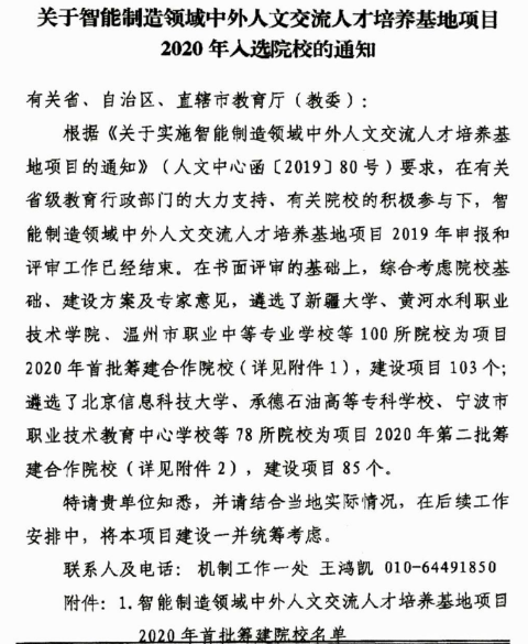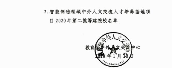 近日,教育部中外人文交流中心公布《关于智能制造领域中外人文交流人才培养基地项目2020年入选院校的通知》(人文中心函〔2020〕9号),beat365成功获批该项目(全国共178所,其中本科39所、高职119所、中职20所)。