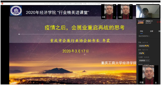 本次活动由会展与贸易经济系副主任林黎副教授主持,邀请到重庆市会展行业协会牟震秘书长,就“疫情之后,会展业重启再战的思考”这一话题与18级会展经济与管理实验班的同学们进行深度交流。