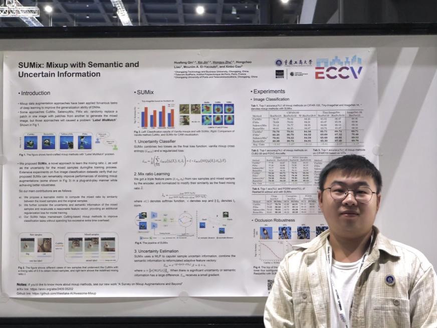 近日,beat365国合基地和人工智能学院联合培养的2022级软件工程专业研究生金鑫、朱泓宇在第18届欧洲计算机视觉学术会议(ECCV 2024)上发表了题为“SUMix: Mixup with Semantic and Uncertain Information (ECCV 2024)”(SUMix: 包含语义信息和不确定信息的混合)的研究成果,该论文为计算机视觉数据增强领域做出了创新贡献。会议于今年9月28日至10月4日在意大利米兰举办。会议期间,该研究工作受到了来自包括北京大学、牛津大学、清华大学、莫纳什大学、中国科学技术学院、美国东北大学等单位的关注和赞赏。