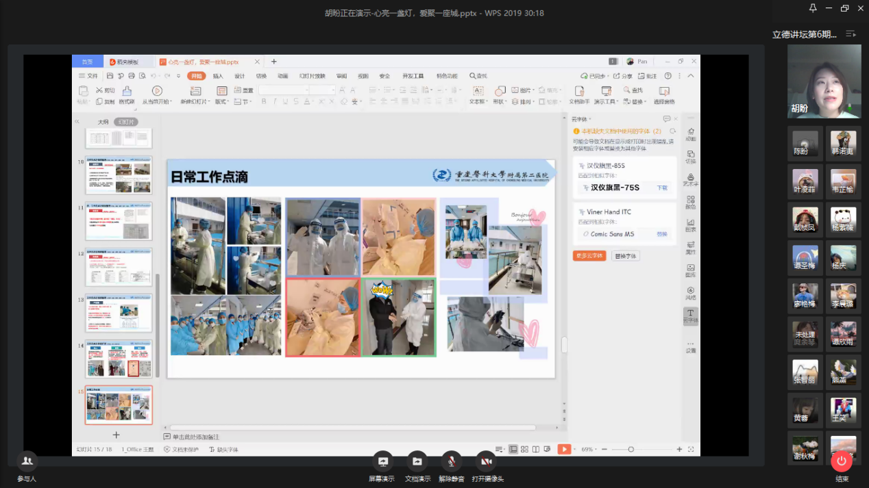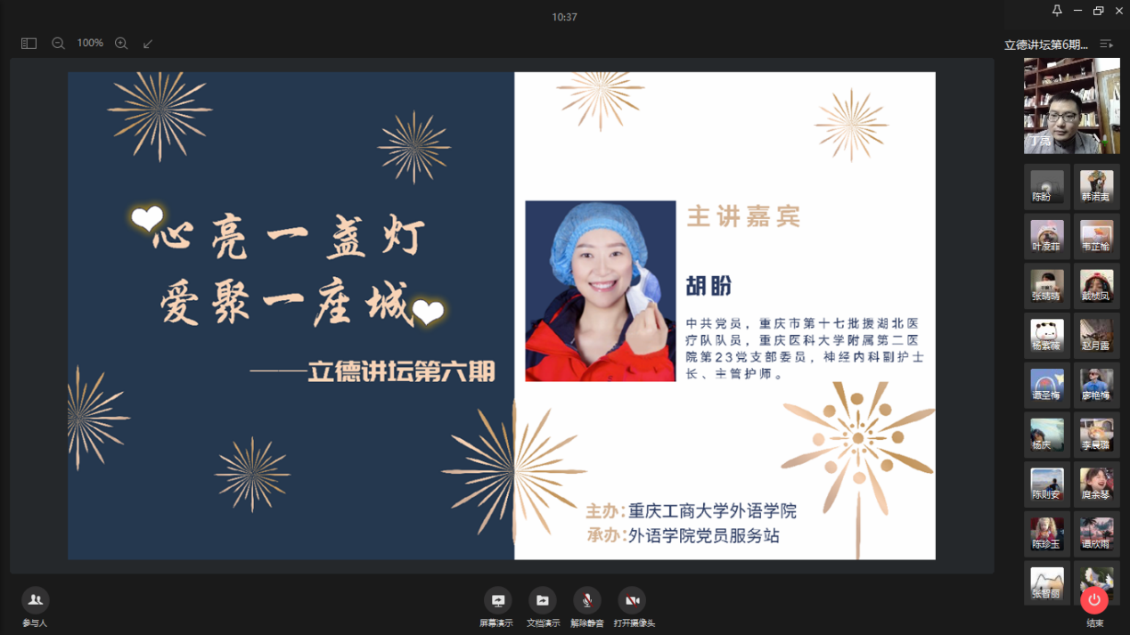 2020年4月17日晚,外语学院党员服务站“立德讲坛”第六期——“心亮一盏灯,爱聚一座城”线上分享活动在企业微信群顺利举办。此次活动特别邀请到重庆市第17批援湖北医疗队队员、重庆医科大学附属第二医院第23党支部委员、神经内科主管护师胡盼副护士长作为主讲嘉宾。外语学院党总支书记陈晓东、党总支副书记程亚以及来自全校不同学院100余名师生参与了本次活动。活动由外语学院党员服务站指导老师丁亮主持。