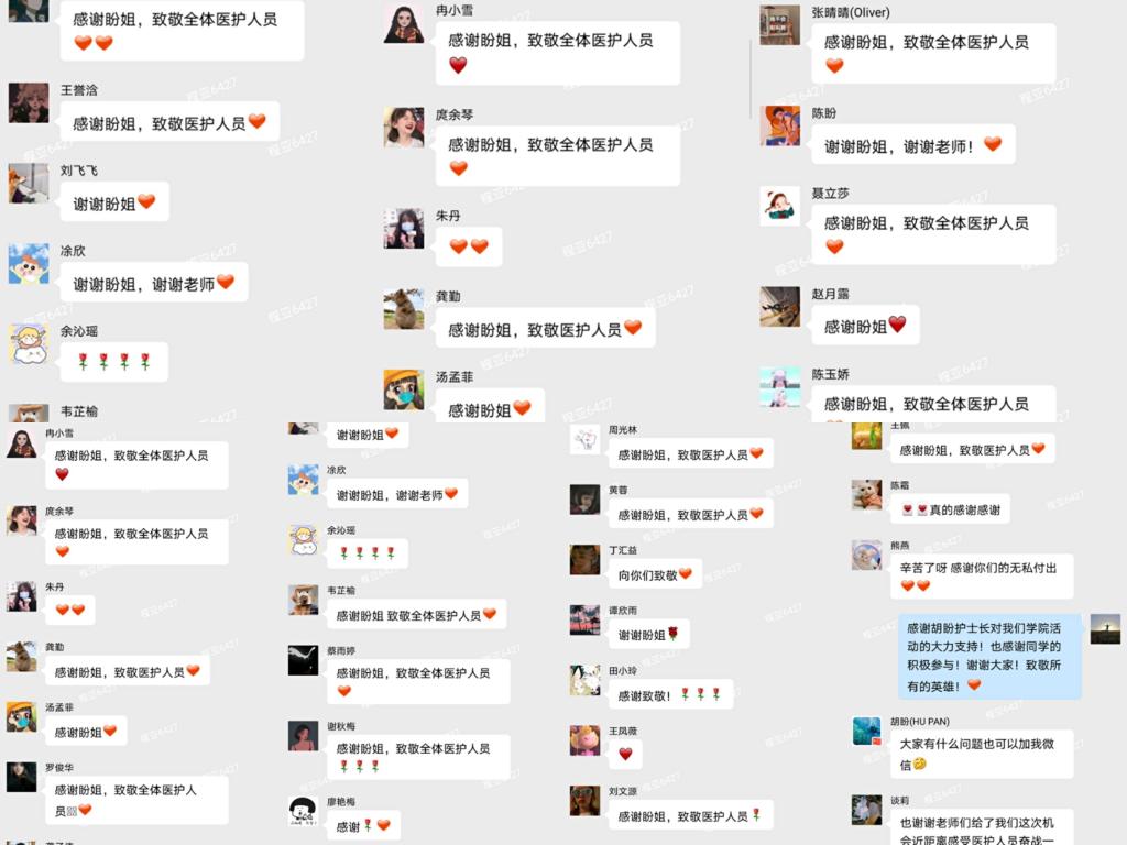 在互动环节,同学们争先恐后与胡盼护士长连线,对胡盼护士长及全体医护人员表达了最真诚的感谢与敬佩。其中,16级法语专业李美玲同学饱含深情地为胡盼护士长及所有抗“疫”医护人员朗读了她亲笔写的《献给广大奋斗在一线的医护人员的一封信》。听了同学们的发言,胡盼护士长满怀感动,她为同学们在疫情爆发期间能够严于律己点赞,她希望通过这次抗击疫情,同学们能够更加正确地认识自己的国家,公正地看待医护工作者,立足现实,增强自己的本领,在祖国需要我们的时候能敢于担当,挺身而出。