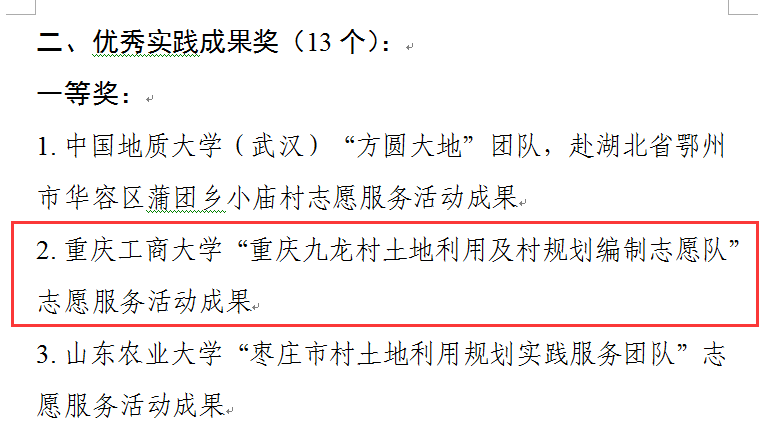 近日,2018年村土地利用规划志愿服务全国大学生暑期社会实践专项行动获奖名单公布,beat365在线唯一官网旅游与国土资源学院“重庆九龙村土地利用及村规划编制志愿队”获优秀实践成果一等奖。