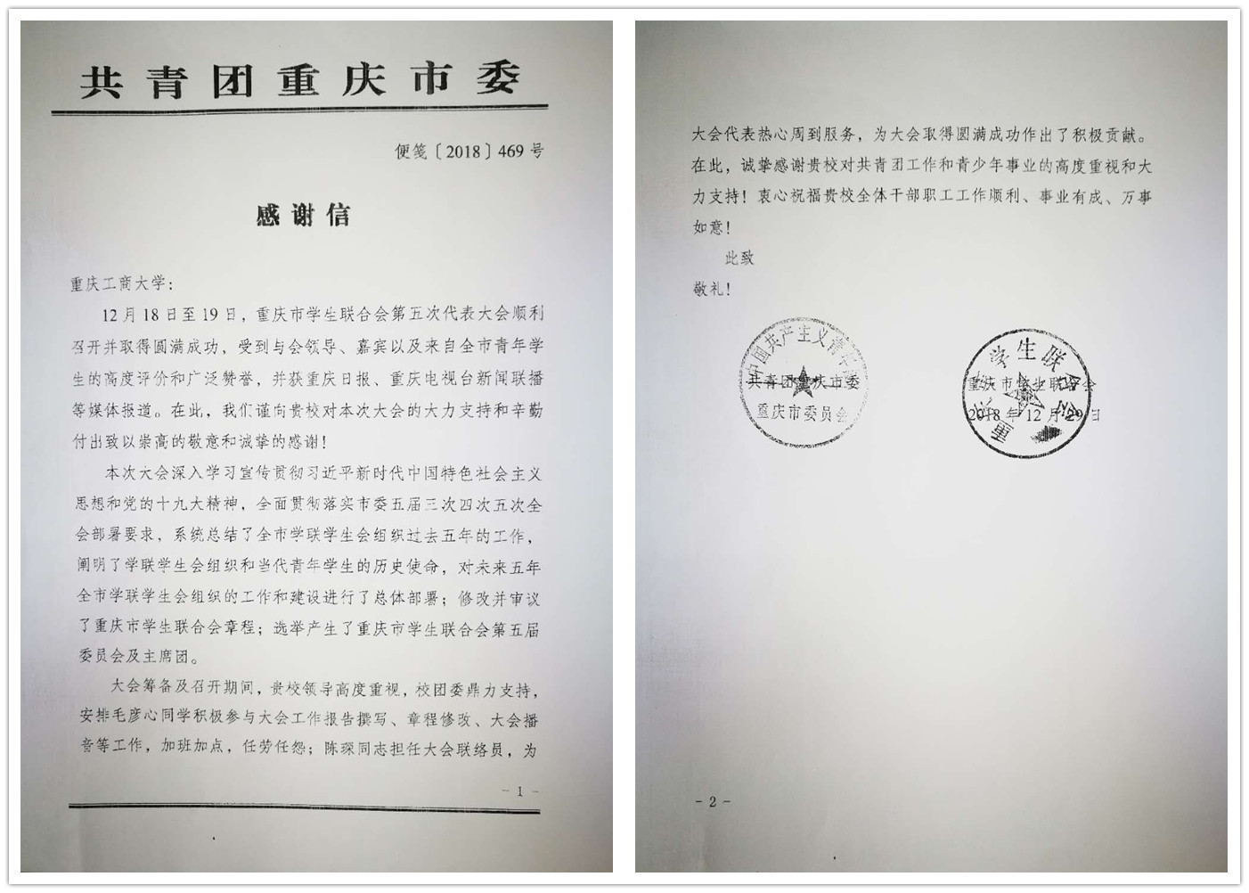 2018年12月18至19日,重庆市青年联合会第五届委员会第一次会议、重庆市学生联合会第五次代表大会在市委礼堂召开,beat365师生参与会议志愿服务,热心周到的服务获赞誉,共青团重庆市委、重庆市青联合会还专门向beat365发来了感谢信。