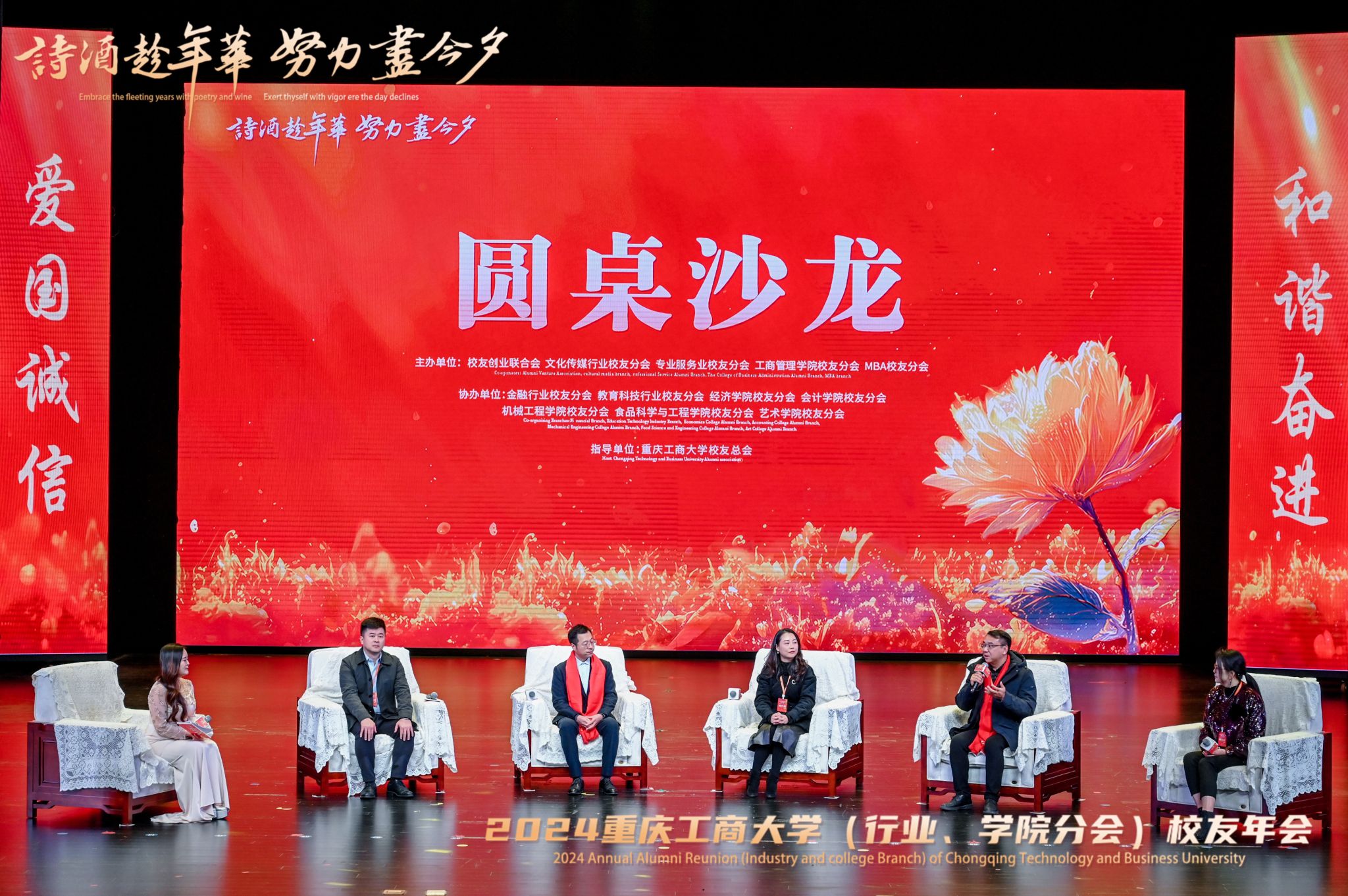 重庆金融科技研究院院长杨开元,2009级艺术设计校友、青鲸文化创始人廖李平,1999级金融校友、重庆博仕康科技总经理万娟,2003级机械设计校友、邓家刀第五代传承人、销售总监张波,2004级酒店管理校友、燕硰品牌创始人徐晴聚焦“数字经济时代的机遇与挑战”展开了圆桌沙龙研讨。