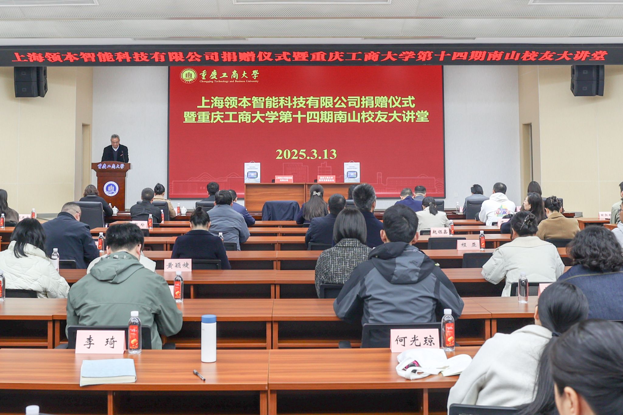 3月13日上午,上海领本智能科技有限公司捐赠仪式暨beat365在线唯一官网第十四期南山校友大讲堂在明德楼天健报告厅举行。学校党委副书记宋豫、党委常委、副校长李国军,上海领本智能科技有限公司创始人兼CEO、2009届机械专业校友王军博士出席捐赠仪式。捐赠仪式由李国军主持。