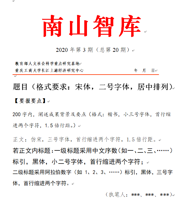 3、决策咨询成果一律以Word电子文档的形式申报(不接受纸质文稿);每篇决策咨询成果必须独立申报,不可重复申报。决策咨询成果严格按照《南山智库》体例编排,字数一般控制在3000字左右。稿件由摘要、正文、作者信息、项目来源等信息组成。