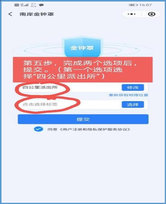 【第五步】:完成两个选项后提交即可(第一个选项选择“四公里派出所”)。