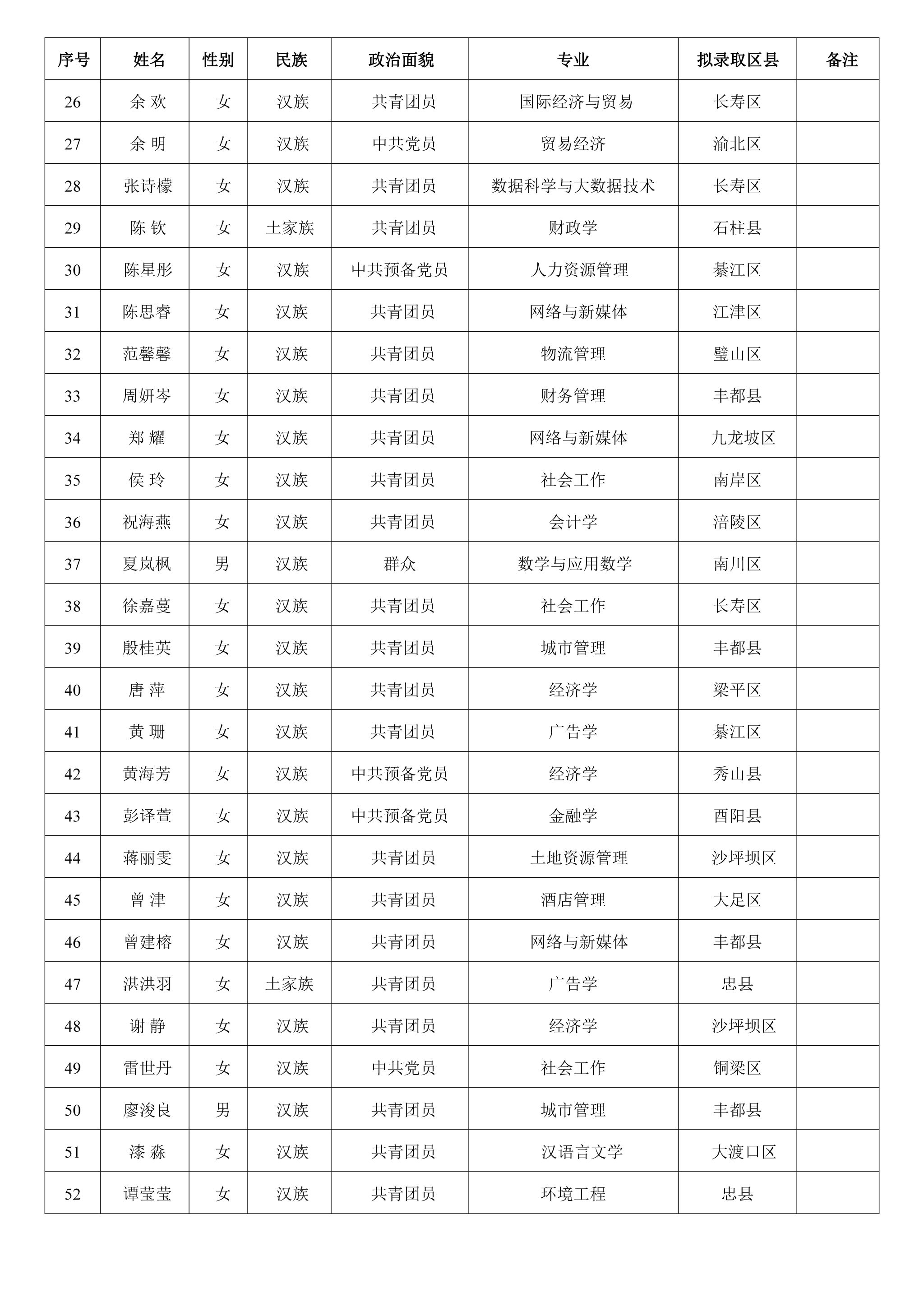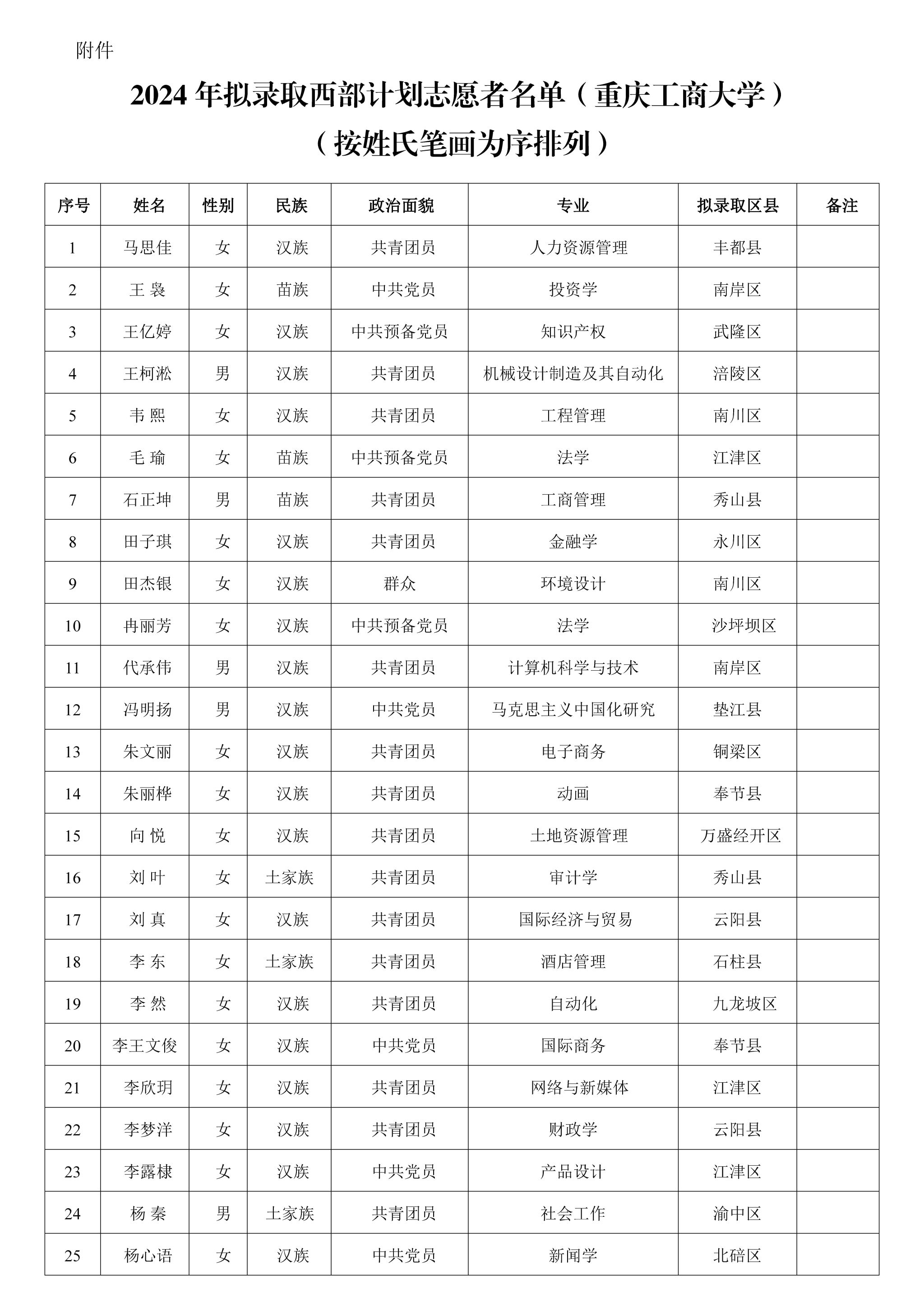按照重庆市西部计划项目办的统一部署和安排,经学生本人报名、各学院推荐、校团委审核、重庆市各区县项目办招募考核等环节,根据6月5日市项目办反馈情况,现将beat3652024年赴市内参与西部计划服务拟录取名单公示如下:(共52名,按姓氏笔画为序排列)