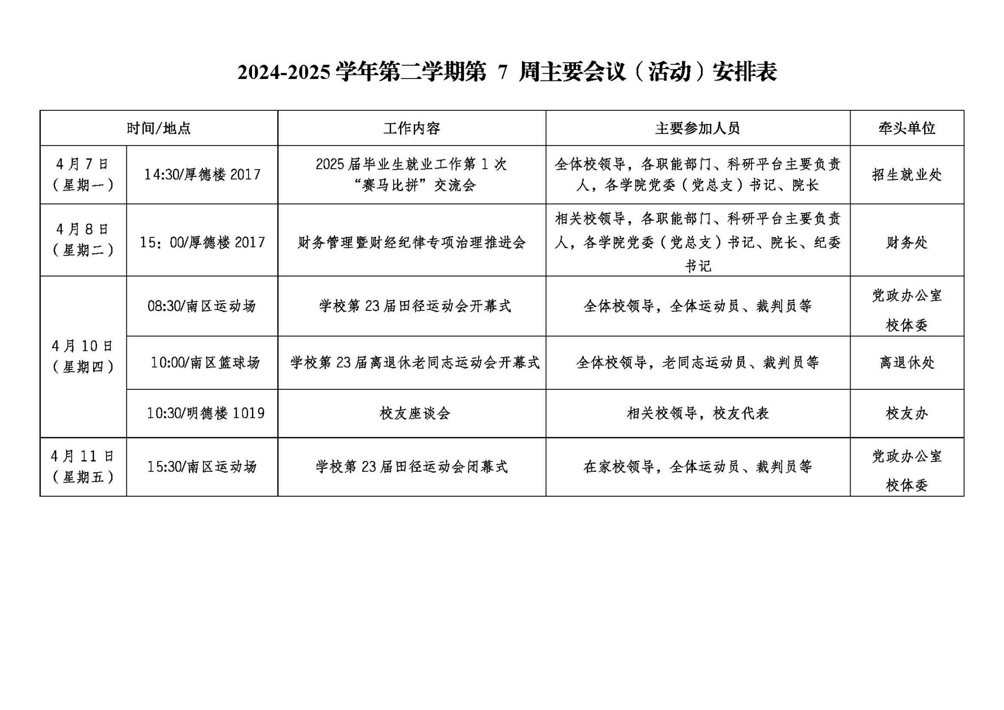 2024-2025学年第二学期第 7 周主要会议(活动)安排