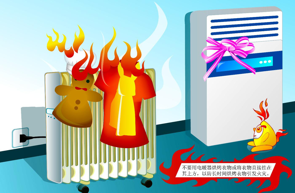 使用如电热毯、取暖器等电热器具时,尽可能做到通电时有人看守,避免电热器具在长时间通电情况下烤燃附近的可燃物,或因电热器具发热温度过高,引起自身燃烧。