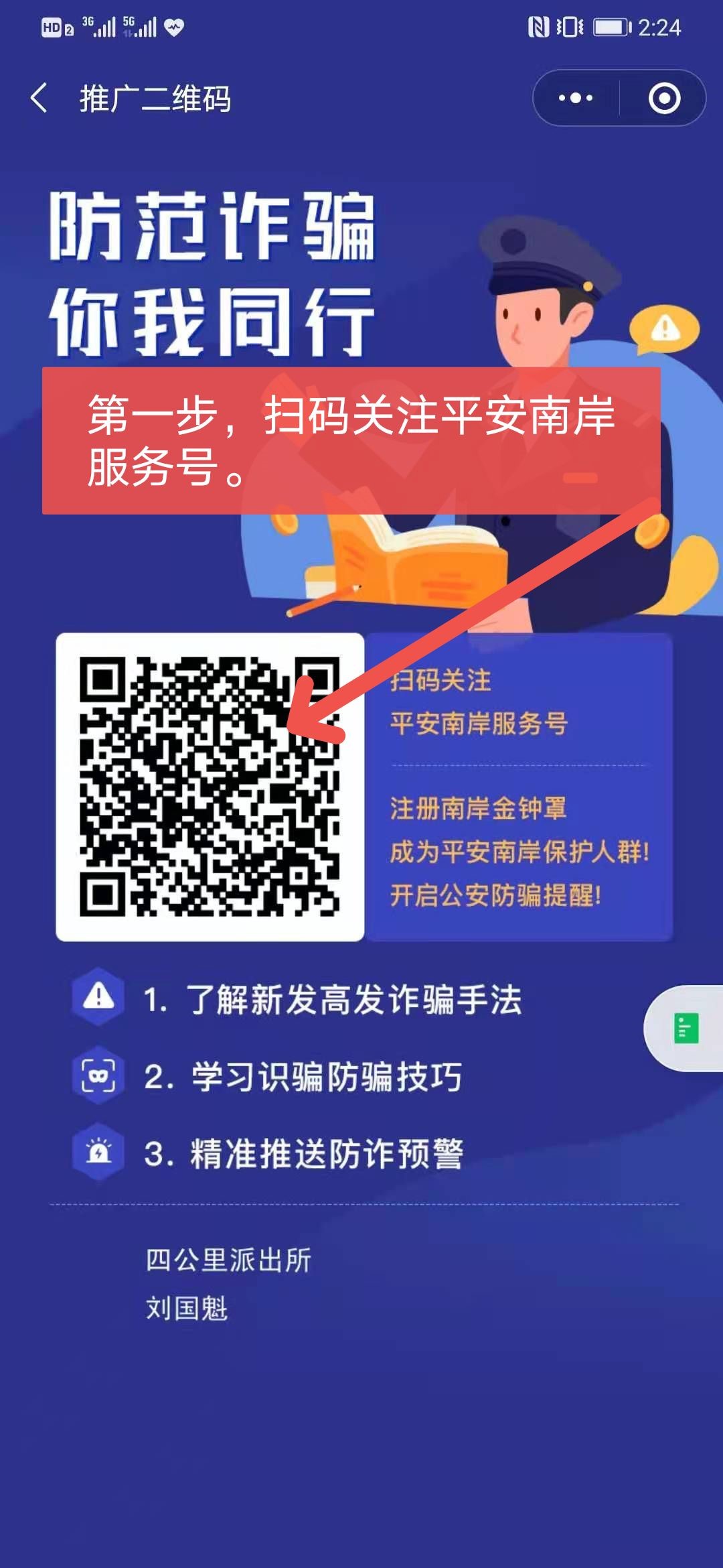 1.“金钟罩”反诈防骗小程序介绍。“金钟罩”是公安机关联合深圳安巽科技引入的一款反诈防骗小程序,该程序依托于微信公众号系统,汇集了大量电信网络诈骗数据信息,利用其自身强大的数据分析研判能力,能够快速地甄别疑似电信网络诈骗嫌疑人的来电和信息,并迅速采取有针对性的防范和预警措施。通过扫码方式关注“平安南岸”服务号,并成功注册“金钟罩”账号后,系统会对注册人及其家人起到精准防骗保护作用。注册了“金钟罩”后,当个人或者家人接到诈骗电话、收到诈骗短信、点击高危双址链接、下载或者查询高危APP时,该平台就会立即作出反馈,并实施系统预警和干预。“金钟罩”后台会自动向个人或其家人推送预警信息,提醒你可能已经成为诈骗分子的“猎物”。同时,所对应的辖区民警将根据实际情况,对您进行劝阻和回访,全面做到防范诈骗“双保险”。
