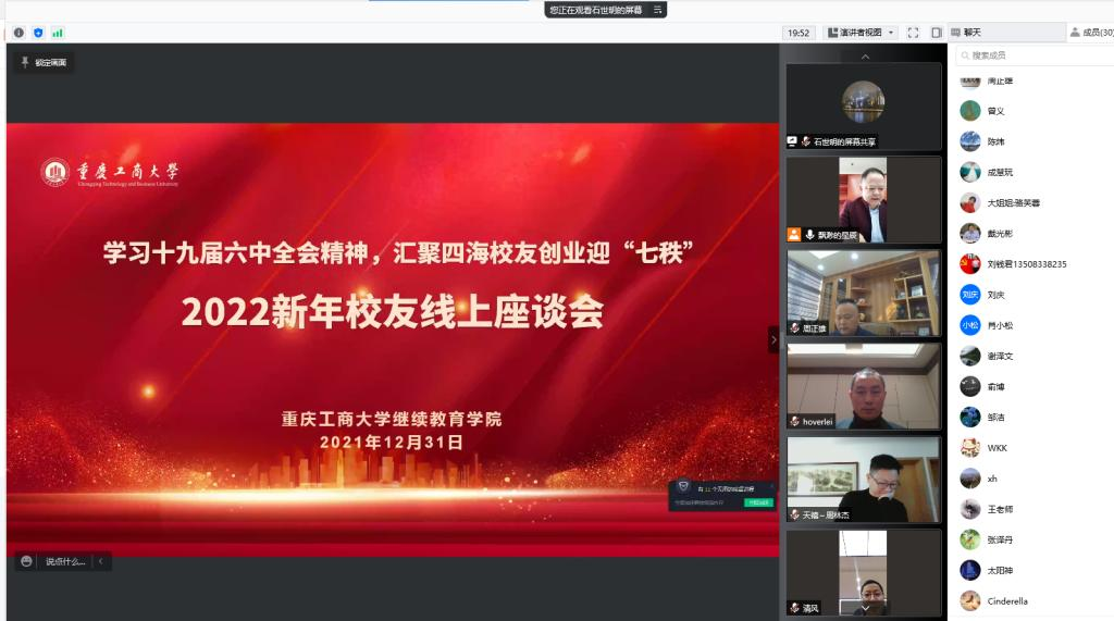 为进一步向校友宣传党的十九届六中全会精神,共同庆祝元旦新年,以崭新的姿态迎接beat36570周年校庆,继续教育学院于12月31日举行了主题为“学习十九届六中全会精神,汇聚四海校友创业迎七秩”2022新年校友线上座谈会。继续教育学院党总支书记石世明、院长杜朝辉、学院教职工和全国各地校友代表参加了本次座谈会,活动由继续教育学院校友分会秘书长陈之举主持。