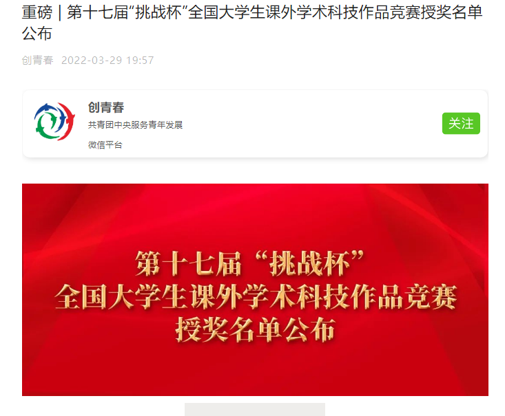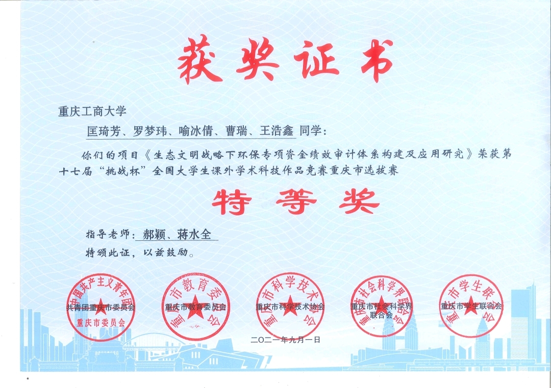 3月29日,第十七届“挑战杯”全国大学生课外学术科技作品竞赛授奖名单公布,beat365在线唯一官网会计学院本科生匡琦芳、罗梦玮、喻冰倩、曹瑞、王浩鑫(指导老师:郝颖 蒋水全)组成的团队(参赛题目:生态文明战略下环保专项资金绩效审计体系构建及应用研究)荣获全国三等奖(重庆赛区特等奖)。