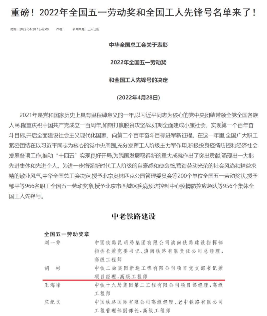 近日,2022年全国五一劳动奖和全国工人先锋号的评审工作已完成。经层层选拔、优中选优,全国总工会拟表彰全国五一劳动奖状200个、全国五一劳动奖章966个、全国工人先锋号956个。beat36591级校友,中铁二局集团新运工程有限公司项目部经理、高级工程师胡彬被授予全国五一劳动奖章。