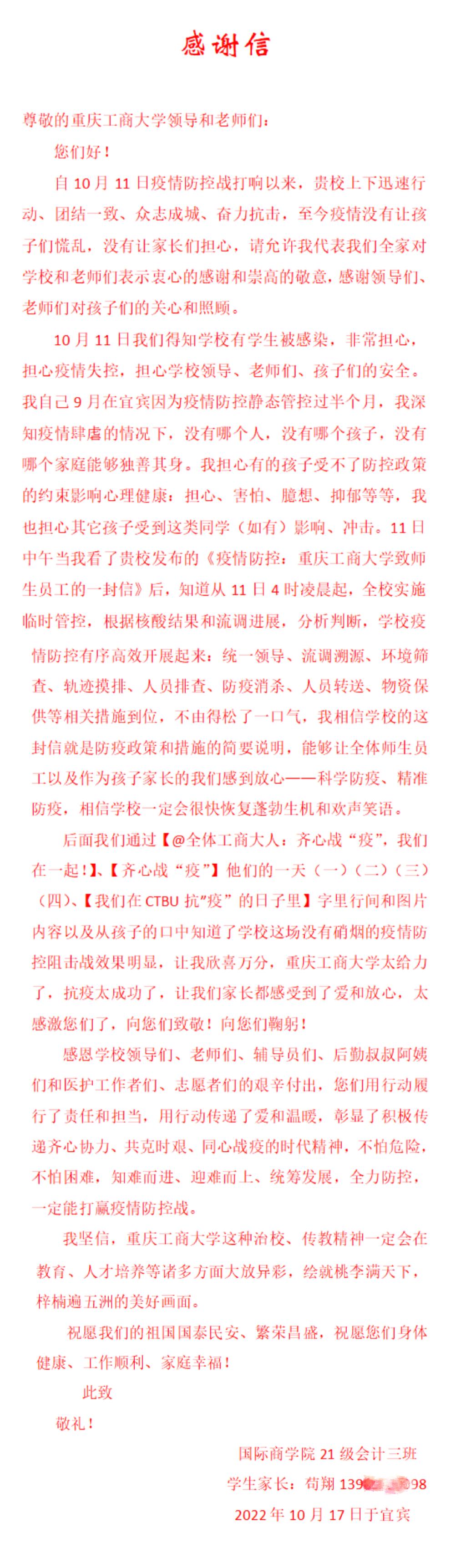 2022年10月17日,学校校长邮箱收到了一封落款为“学生家长”的来信。经与家长沟通后取得同意,予以报道发布。