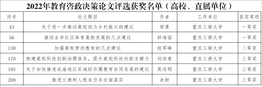 近日,重庆市教育委员会印发《重庆市教育委员会关于2022年教育咨政决策论文评选结果的通报》,beat365获一等奖2篇、二等奖1篇、三等奖3篇,获奖总数位列市属高校前三名。学校智库建设成效进一步显现。
