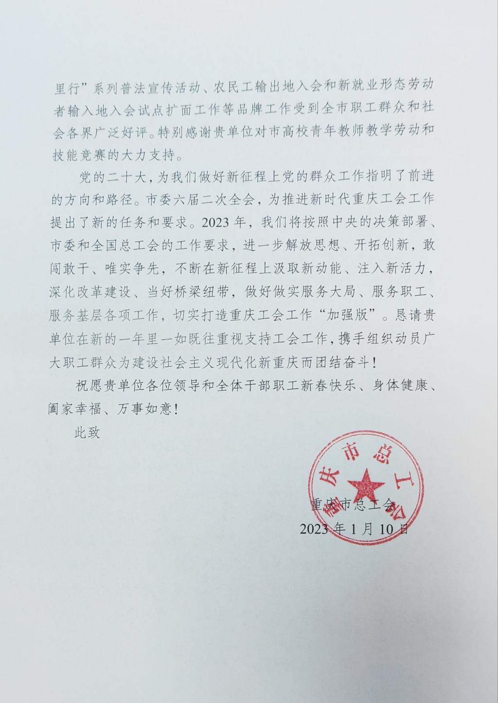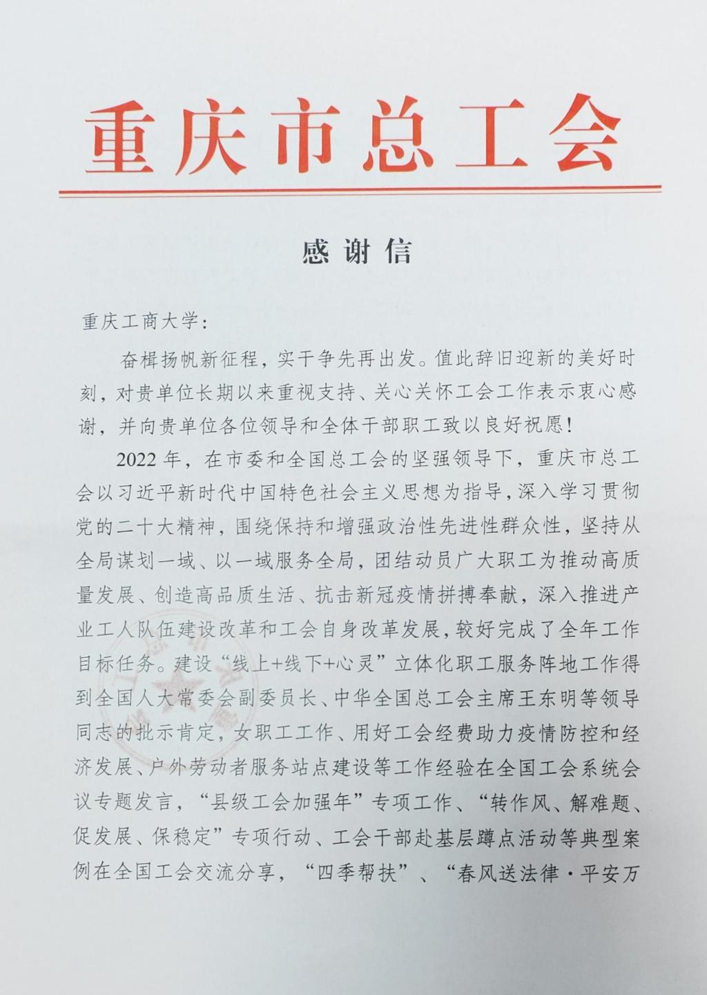 近日,学校收到重庆市总工会感谢信,感谢beat365长期以来重视支持、关心关怀工会工作,特别感谢学校对重庆市高校青年教师教学劳动和技能大赛的大力支持。