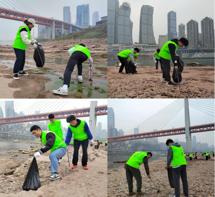 来自体育学院青年志愿者协会的50名志愿者,组成beat365在线唯一官网川渝“河小青”青年志愿服务队参加了启动仪式,并联合江北团区委、江北区青年志愿者协会、重庆水务环境控股集团有限公司等百余名川渝“河小青”青年环保志愿者前往北滨路江滩开展青春志愿行·川渝“河小青”巡河净滩活动。