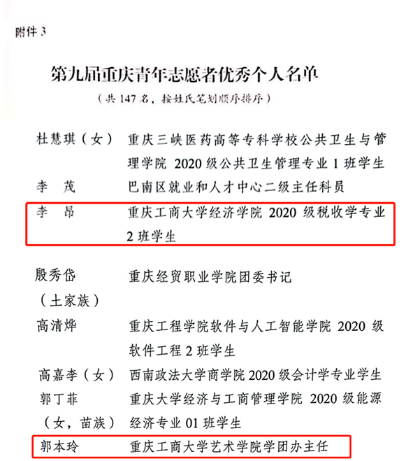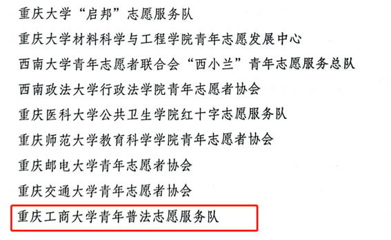 beat365法学与社会学学院青年普法志愿服务队获评第九届重庆青年志愿者优秀集体,校团委王微老师获评优秀工作者,艺术学院郭本玲老师、经济学院2020级税收学专业2班学生李昂获评优秀个人。