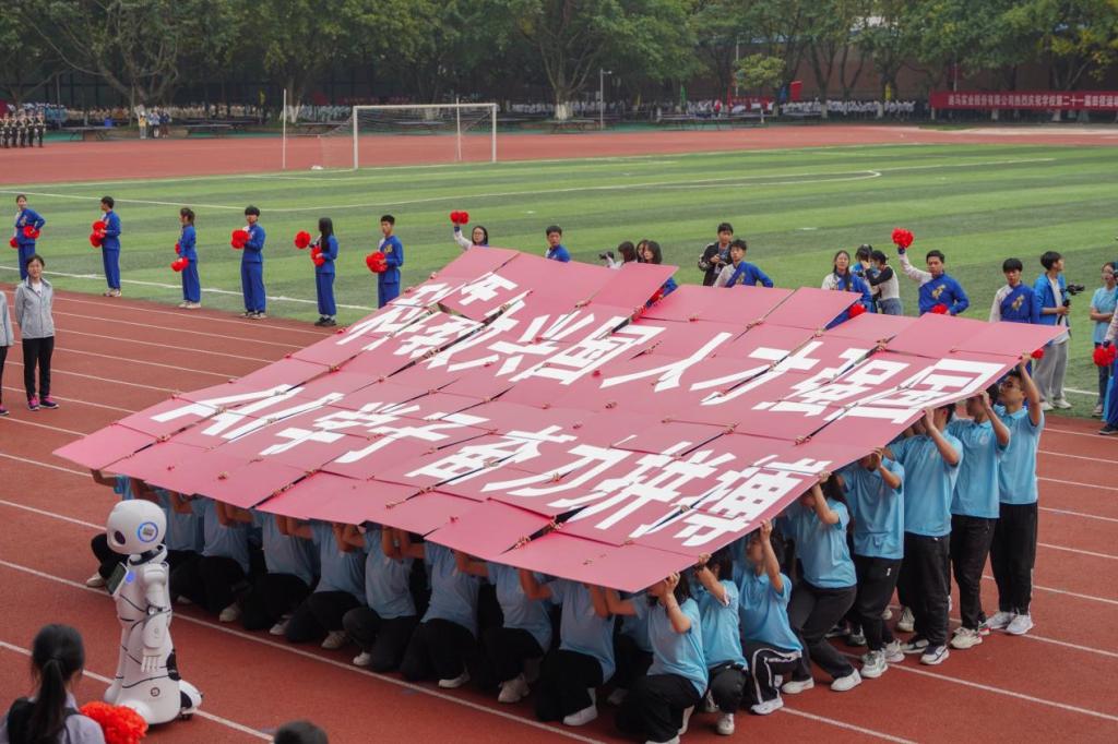 通识学院带来百人啦啦操《青春追梦人》。他们手上花球翻转,脸上洋溢着自信的笑容,用音符跳出青春的旋律,将舞步融入追寻的梦想,随着队形的变换,跑道上出现“CTBU”的字样,释放出了重工商大学子的青春能量。