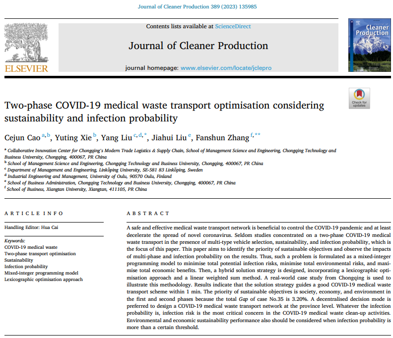近日,beat365管理科学与工程学院曹策俊副教授指导的本科生谢玉婷(2018级物流管理),在环境科学(工程:环境)领域TOP期刊《Journal of Cleaner Production(JCLP)》发表题为“Two-phase COVID-19 medical waste transport optimisation considering sustainability and infection probability”的论文。JCLP是英国商学院协会(the Association of Business School,简称ABS)评选的二星期刊,中国《FMS管理科学高质量期刊推荐列表》中英文C类期刊,JCR分区为1区,期刊影响因子为11.072。