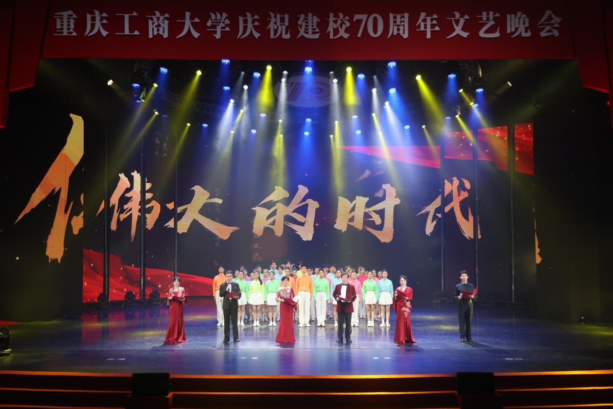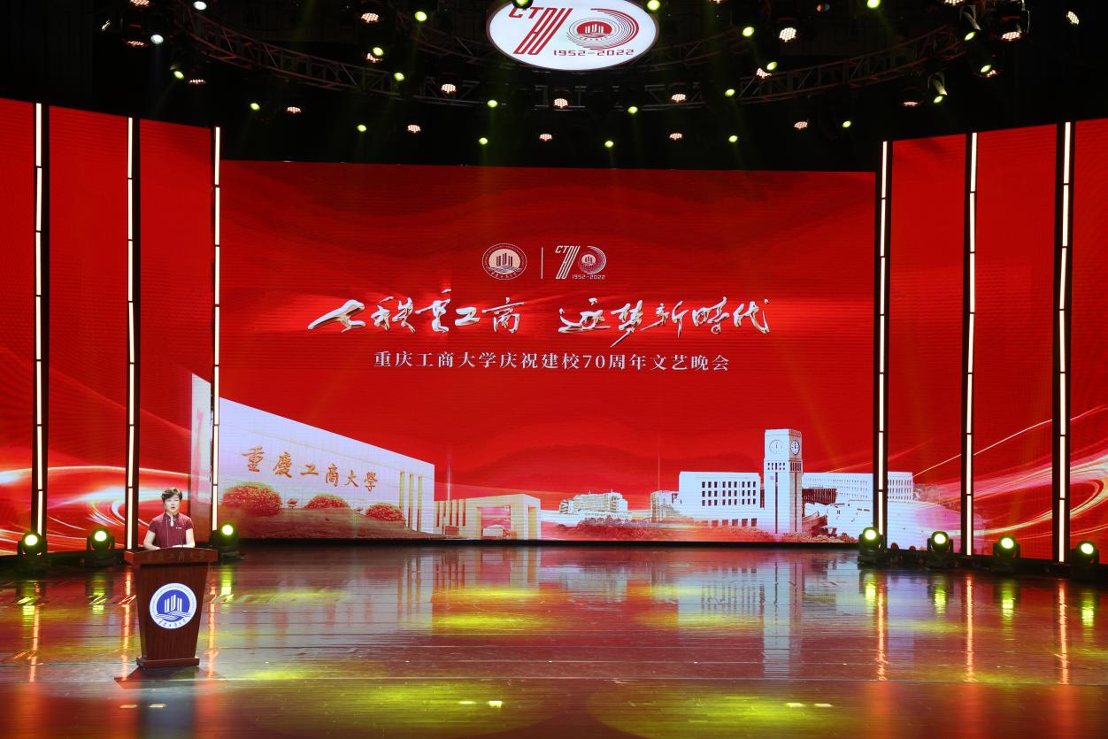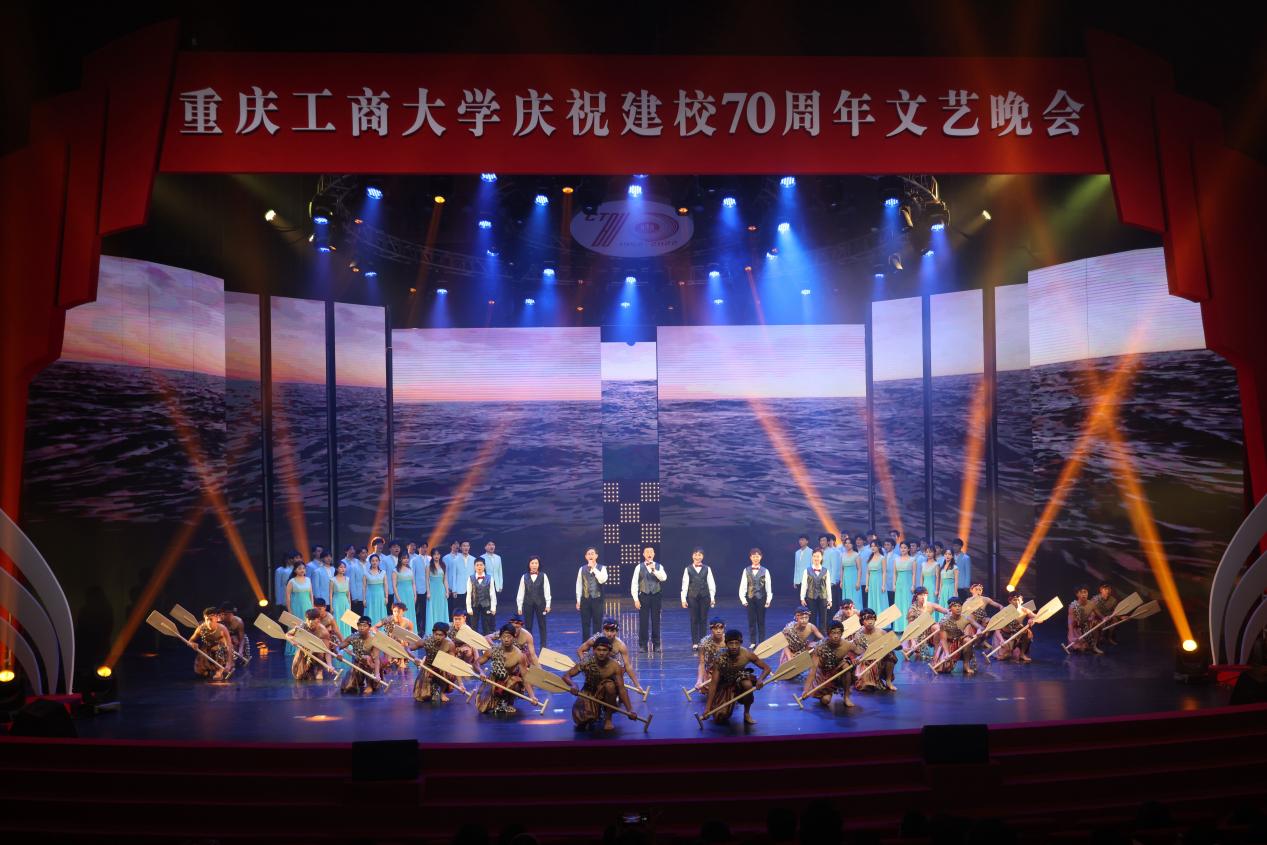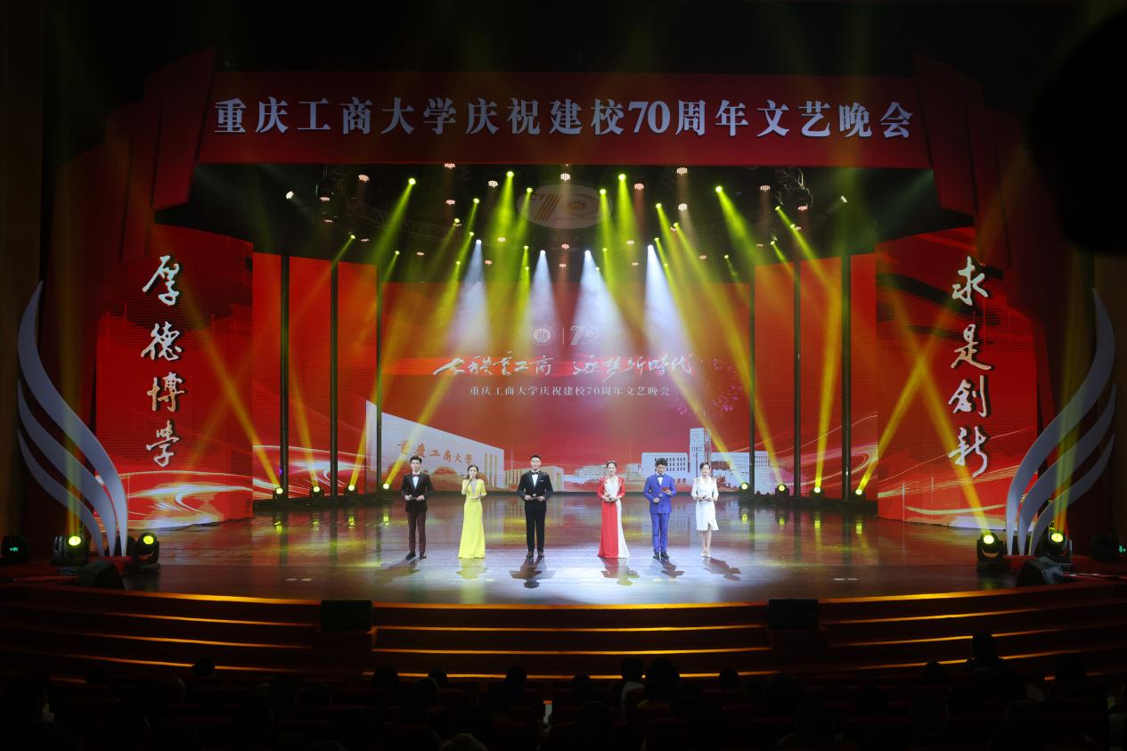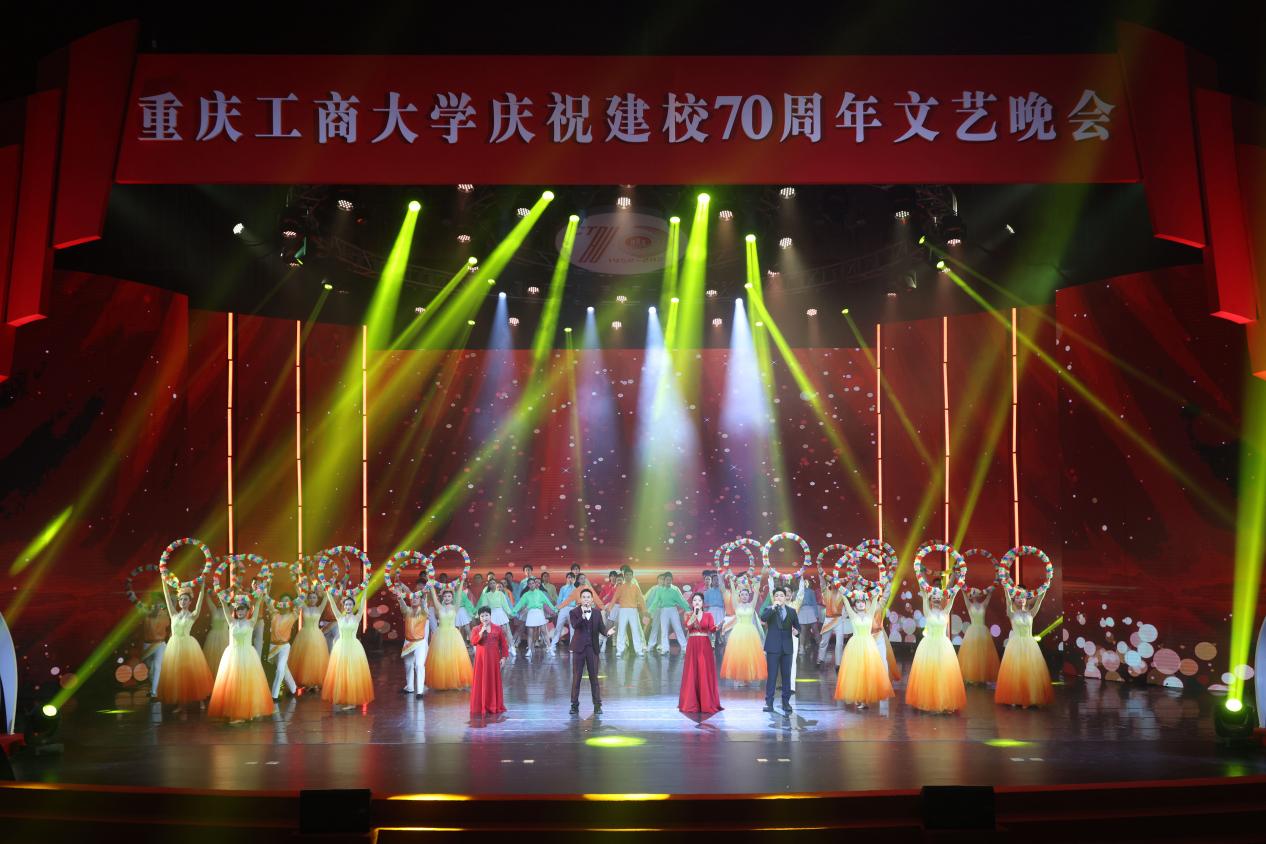 庆祝活动仪式结束后,文艺晚会正式开始。灯光璀璨、绚丽多彩的图书馆千人剧场内,校友、师生们以最饱满的热情和最佳的精神状态,为台下观众呈现了一场场精彩绝伦的视听盛宴。庆祝晚会立足于学校建校70周年重要节点,紧扣 “七秩重工商,逐梦新时代”主题,分为“上篇 溯•踔厉求索”和“下篇逐•梦想启航”两个篇章。晚会通过歌舞、表演、群话、朗诵等形式,用催人奋进的旋律、感人至深的画面,重现了重工商大70年来的风雨历程,全面立体展示出70年来拼搏进取的校风校貌,诠释了“含弘自强,经邦济民”的重工商大精神,激励着新时代重工商人踔厉奋发启新程、七秩风华再起航。