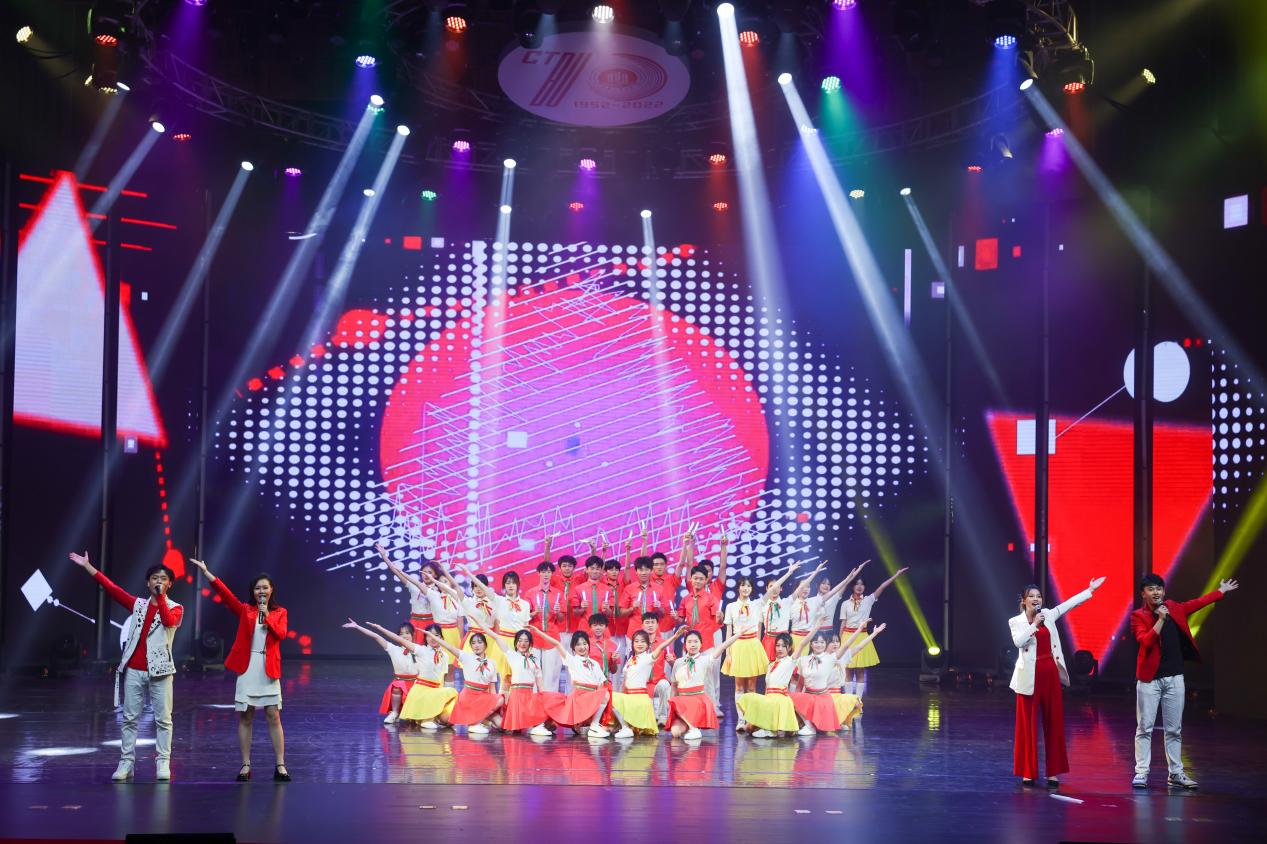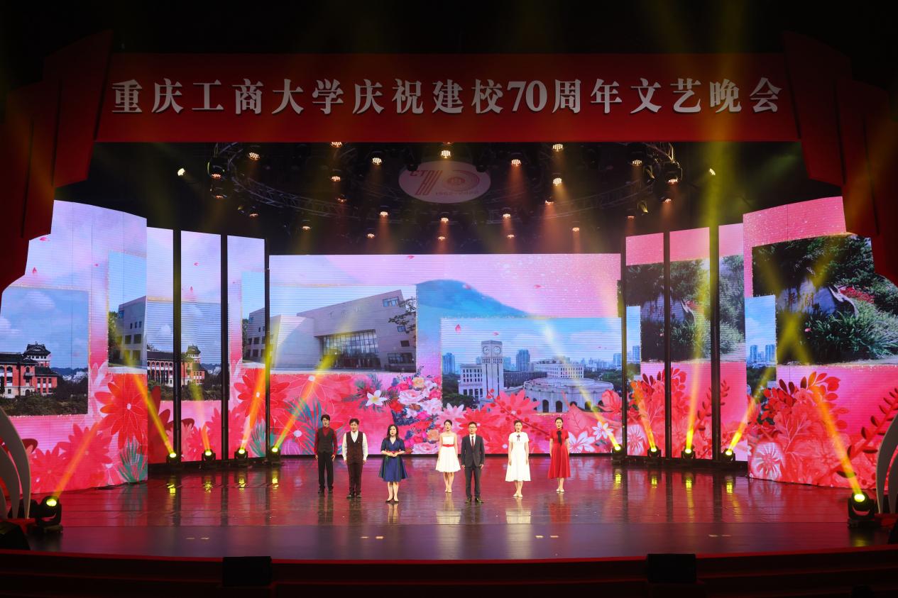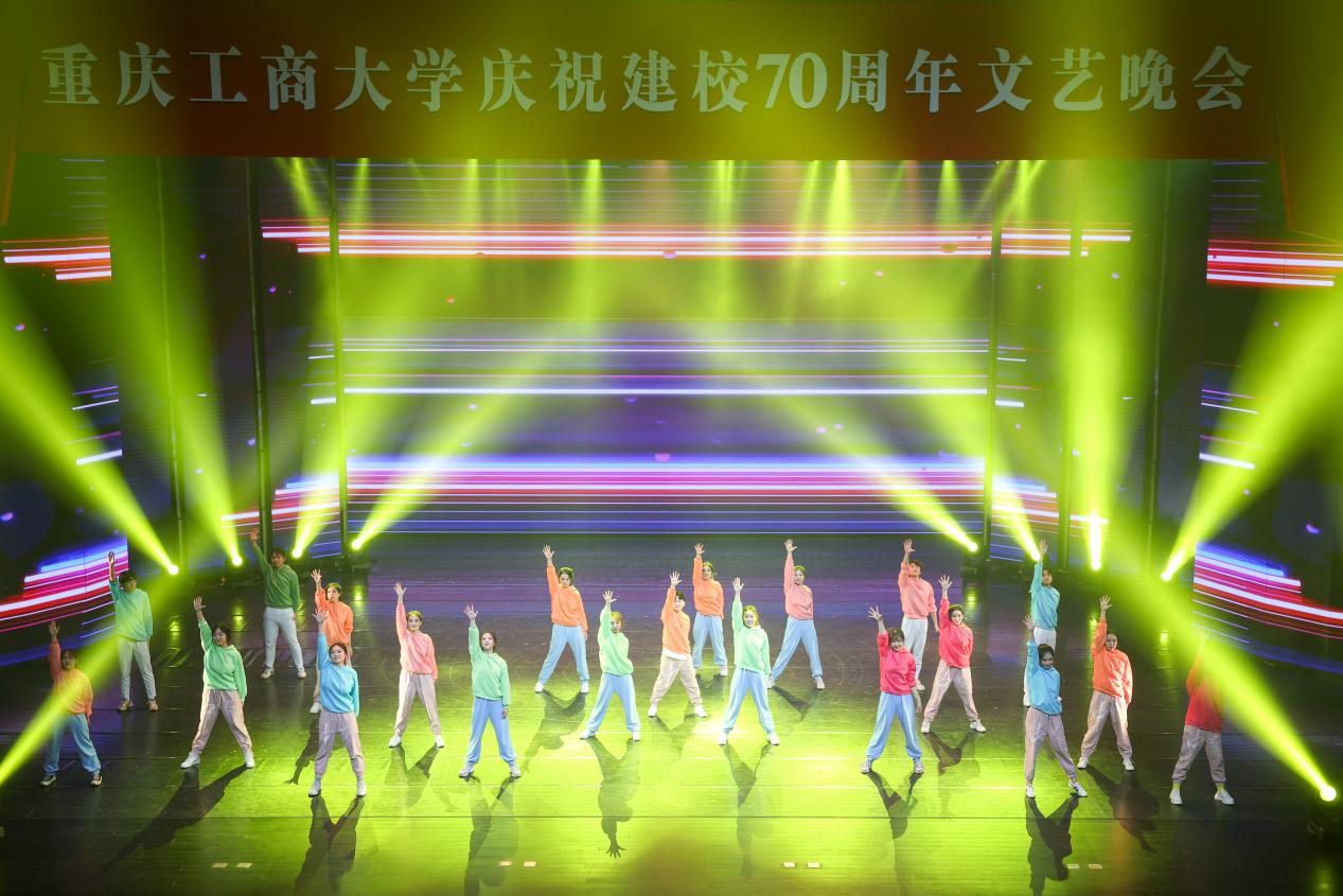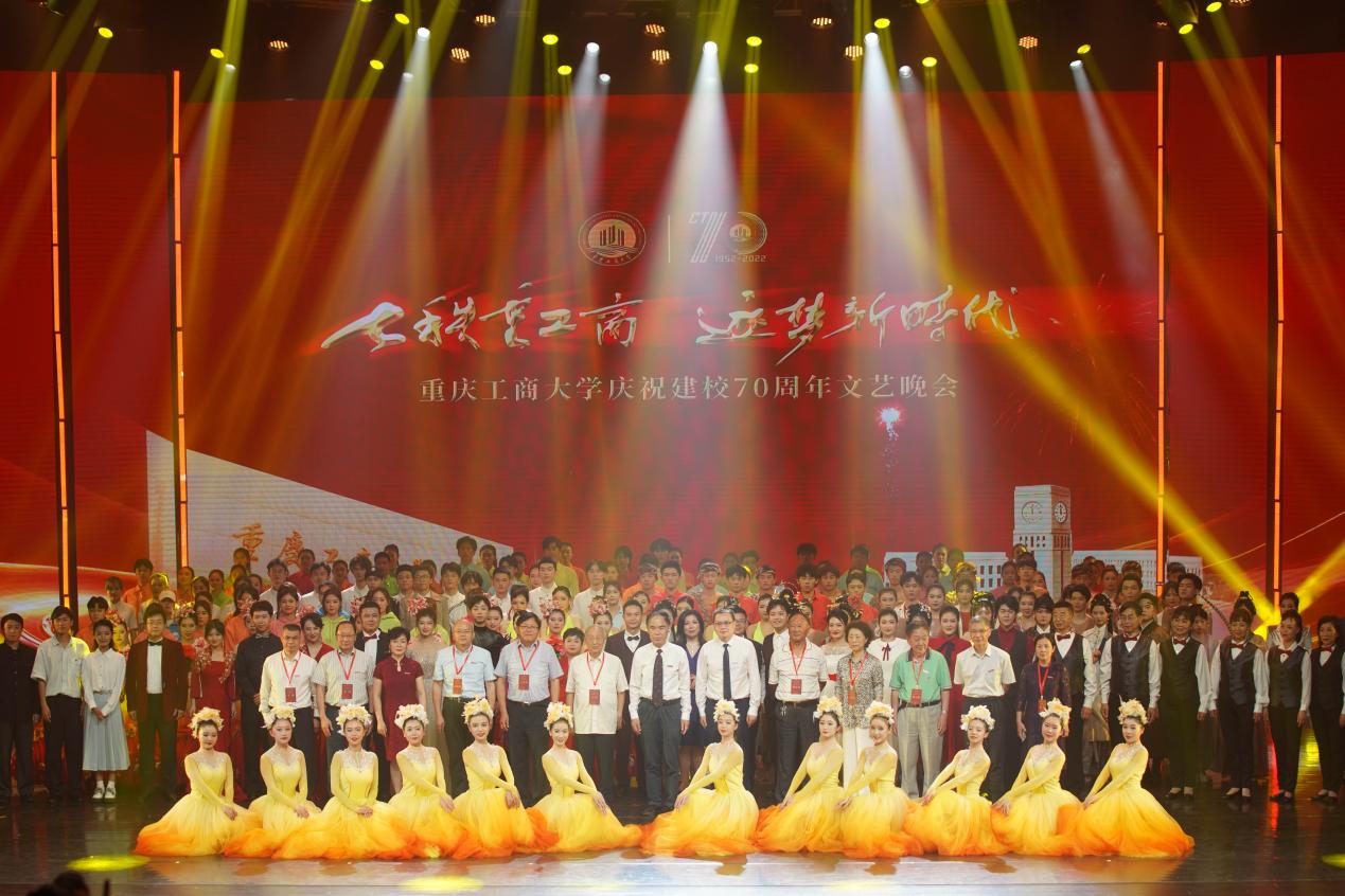 庆祝活动仪式结束后,文艺晚会正式开始。灯光璀璨、绚丽多彩的图书馆千人剧场内,校友、师生们以最饱满的热情和最佳的精神状态,为台下观众呈现了一场场精彩绝伦的视听盛宴。庆祝晚会立足于学校建校70周年重要节点,紧扣 “七秩重工商,逐梦新时代”主题,分为“上篇 溯•踔厉求索”和“下篇逐•梦想启航”两个篇章。晚会通过歌舞、表演、群话、朗诵等形式,用催人奋进的旋律、感人至深的画面,重现了重工商大70年来的风雨历程,全面立体展示出70年来拼搏进取的校风校貌,诠释了“含弘自强,经邦济民”的重工商大精神,激励着新时代重工商人踔厉奋发启新程、七秩风华再起航。