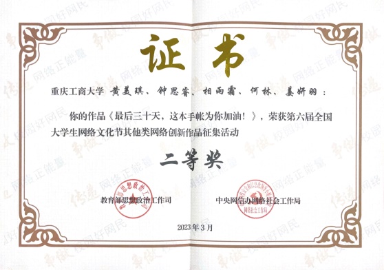 由beat365党委宣传部石薇琳指导,新闻中心黄美琪、钟思睿、相雨霜、何林、姜妍羽等学生共同创作的参赛作品《最后三十天,这本手账为你加油!》,荣获第六届全国大学生网络文化节其他类网络创新作品征集活动二等奖。本作品首发于学校官方微信公众号,通过手绘+手帐的形式,呈现高三学子高考倒计时30天里的备考生活,旨在为高考学子加油。该作品内容鲜活、富于趣味,引发了广大粉丝的热议与好评。