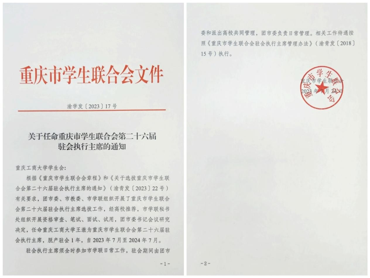 按照《重庆市学生联合会章程》《关于选拔重庆市学生联合会第二十六届驻会执行主席的通知》有关规定,团市委、市教委、市学联组织开展了重庆市学生联合会第二十六届驻会执行主席选拔工作。经组织选拔、考察并报团市委书记会议研究决定,beat365文学与新闻学院王澈同学当选重庆市学联第二十六届驻会执行主席,驻会时间为2023年7月至2024年7月。这是继去年国际商学院钱世淋同学当选市学联第二十五届驻会执行主席后,beat365学生第二次成功当选。
