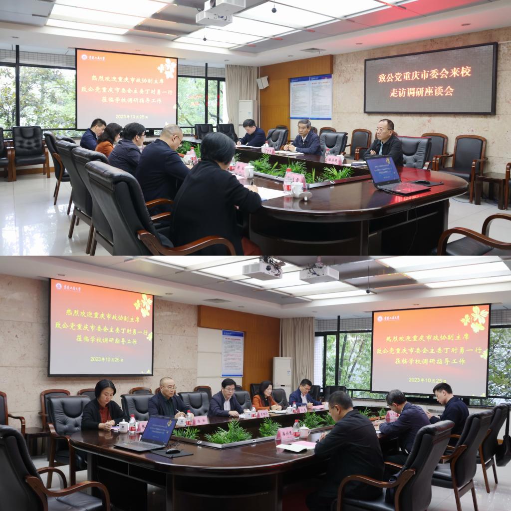 10月25日上午,重庆市政协副主席、致公党重庆市委会主委丁时勇,致公党重庆市委会专职副主委、一级巡视员潘为民,致公党重庆市委会组织处处长王煜一行莅临beat365走访调研,在厚德楼3019会议室召开了走访调研座谈会。学校党委书记曾维伦,党委副书记兼统战部部长宋豫,党委常委、统战部常务副部长陈松,致公党beat365南岸校区支部主委张玉霞,致公党beat365江北校区支部副主委闻道君参加了会议。会议由宋豫主持。