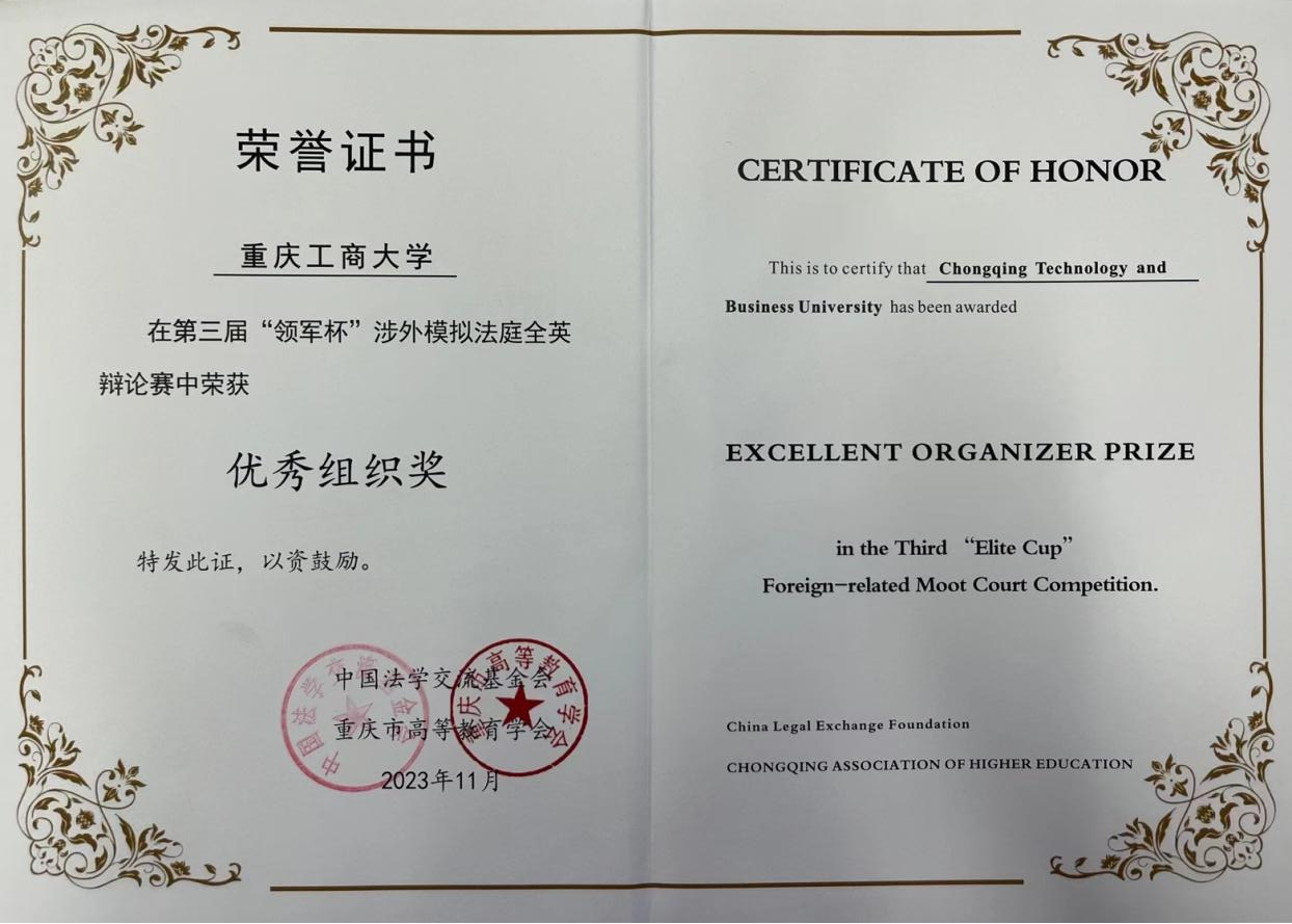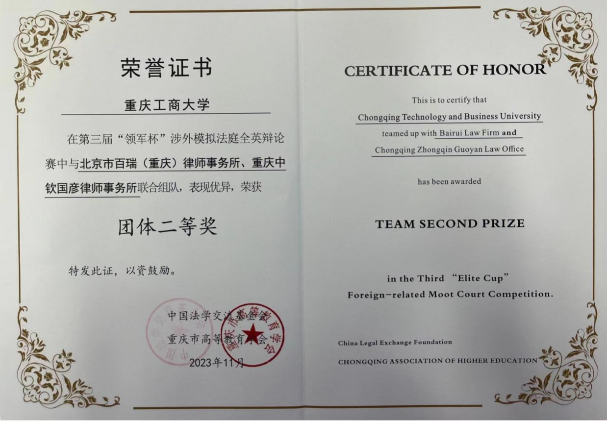 beat365法学与社会学学院本科生张炜嘉、王子慕,研究生蒋利平、廖宇吉在法学系教师向往博士的指导下组队,联合北京市百瑞(重庆)律师事务所、重庆中钦国彦律师事务所律师共同参赛,表现优异,凭借清晰的论证和充足的论据斩获团体二等奖,学校获优秀组织奖。